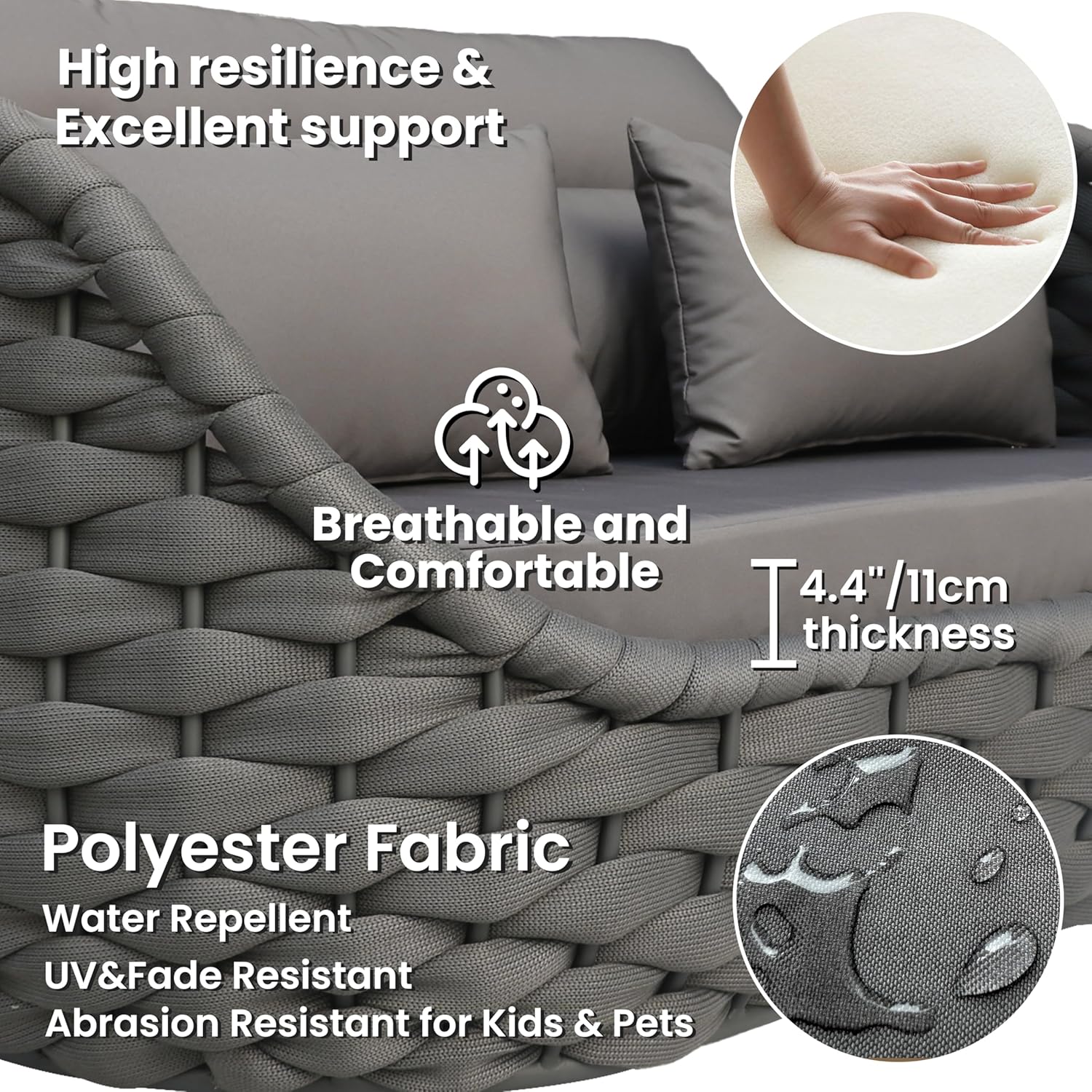 - Filled with 4.3"/11cm thick high-density foam and cotton, cushions are soft touching and breathable for a refresh comfy patio seating holding its shape in long time using. Water repellent and abrasion resistant polyester fabric also fits families with kids and pets