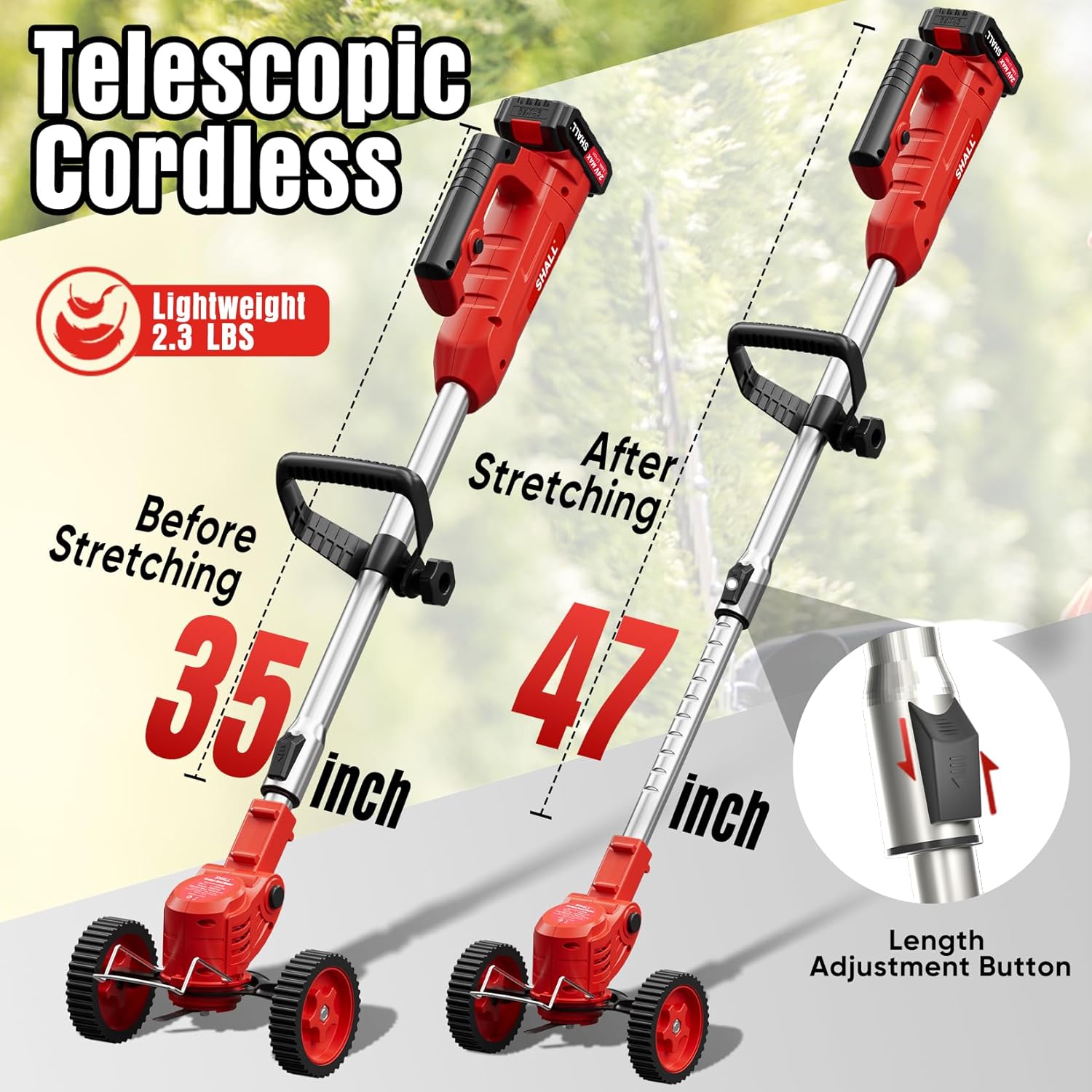 - [Adjustable Height & Auxiliary Handle] - The bush trimmer is telescopic which can be adjusted from 35-47 inches length for all heights people; It also comes with an adjustable auxiliary handle to help work in a most comfortable position