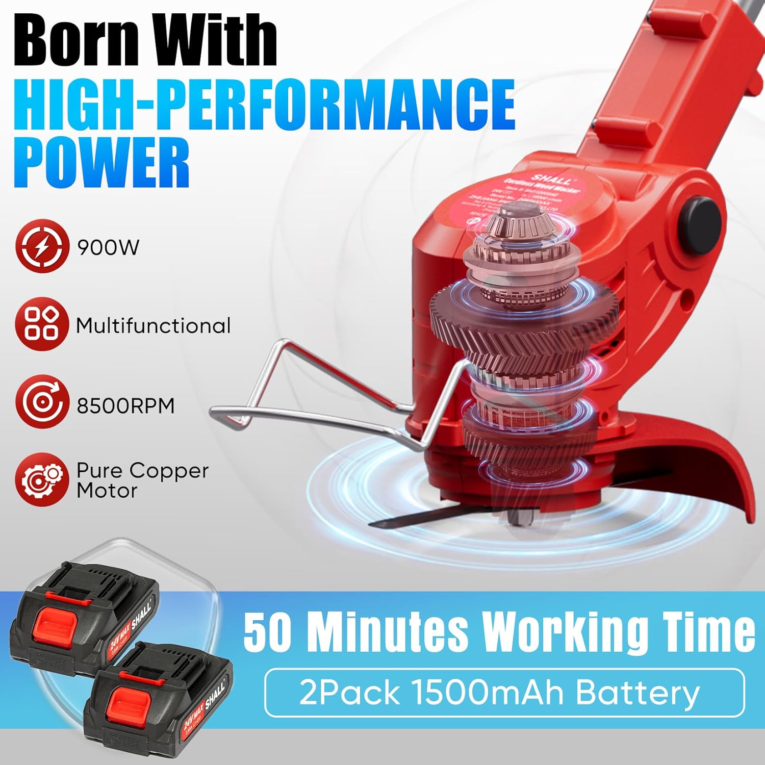 - [Powerful Battery & Motor] - Cordless string trimmer is equipped with a pure copper motor and 2 x 24 V / 1500 mAh rechargeable lithium battery and a fast charger, which allows long continuous working time with low noise; Each battery lasts up to 50 minutes on a full charge