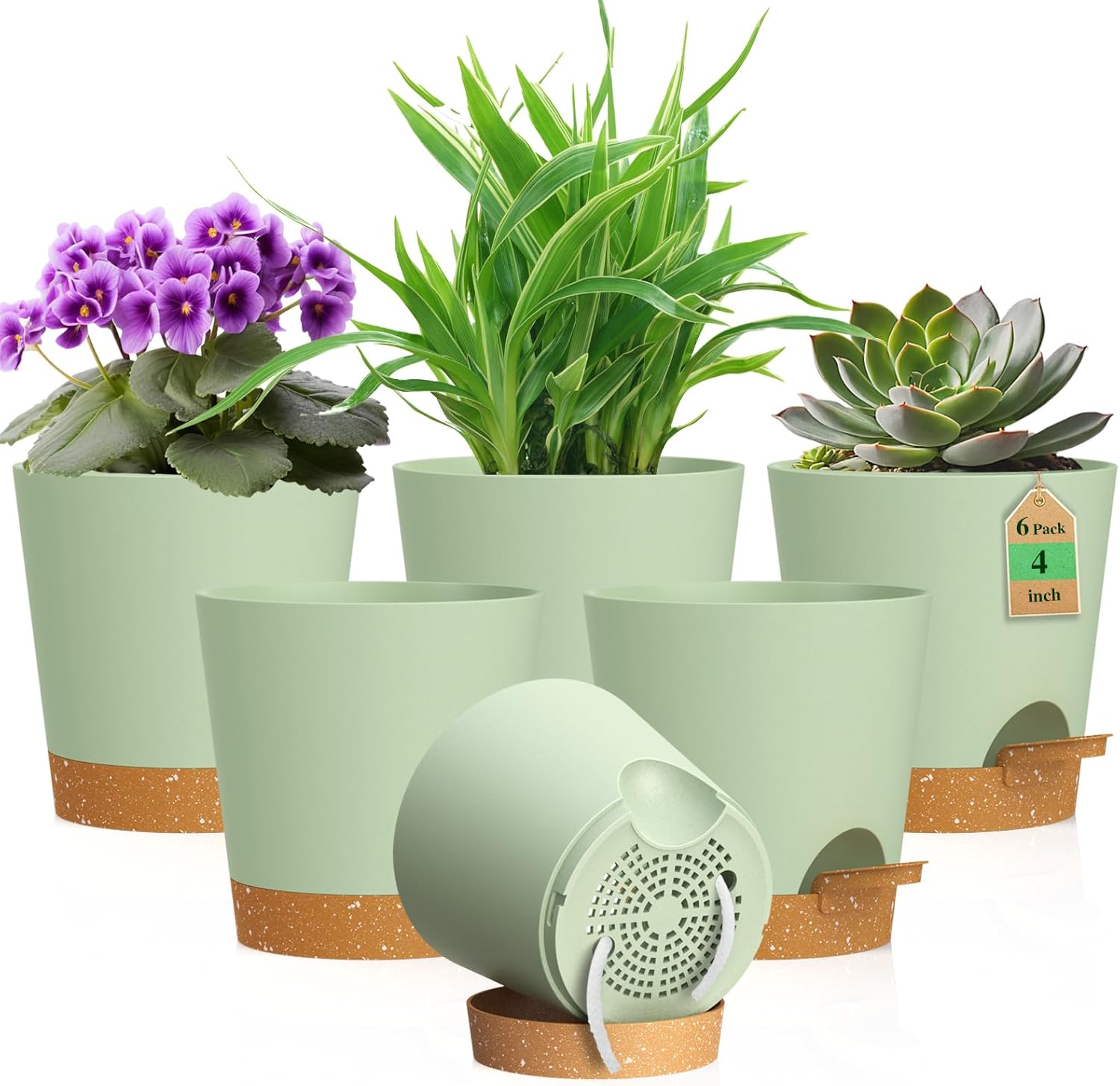 4 inch Self Watering Pots for Indoor Outdoor Plants, 6 Pack Plastic Flower Planters with Drainage Holes and Removable Saucers, Plant Pots with Wicking Rope, Modern Decor, Green Brown