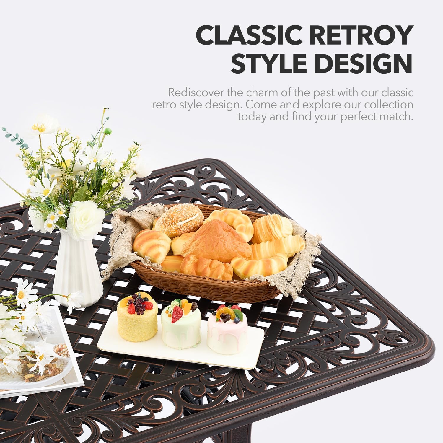 - [CLASSIC RETRO STYLE] This 59” Rectangular outdoor dining table exquisite hollow lattice design, combined with the smooth lines of the cast aluminum surface, adds a touch of elegance and luxury to any outdoor scene such as patio or poolside. With accents such as legs and corner, this collection creates an outdoor oasis that evokes comfortable sophistication.