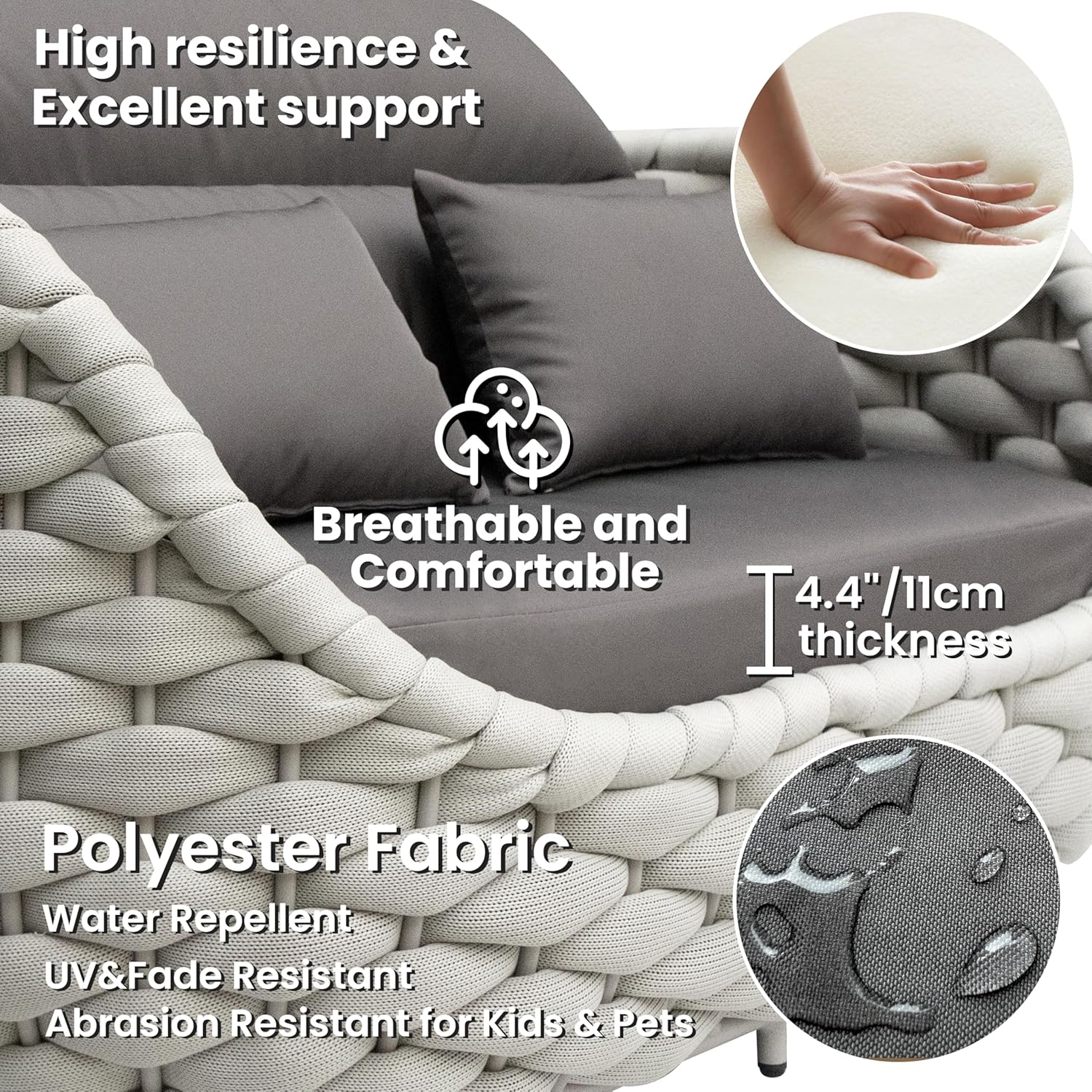 - Filled with 4.3"/11cm thick high-density foam and cotton, cushions are soft touching and breathable for a refresh comfy patio seating holding its shape in long time using. Water repellent and abrasion resistant polyester fabric also fits families with kids and pets