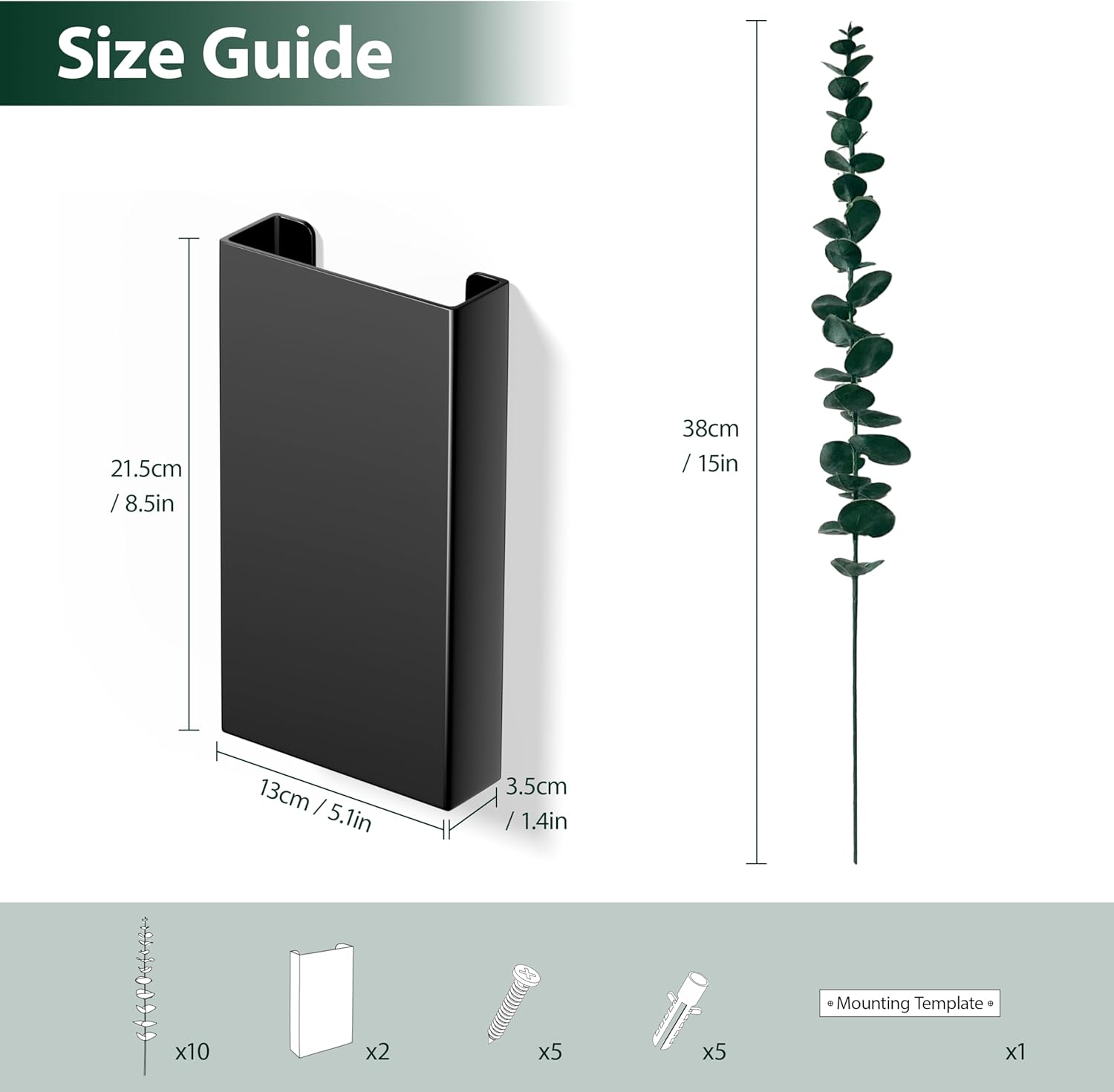 - The set includes 2 wall-mounted planters and 10 artificial eucalyptus stems, perfect for adding greenery to any room. Each planter measures 8.5 x 5.1 x 1.4 inches, making it ideal for farmhouse-style vertical decor.