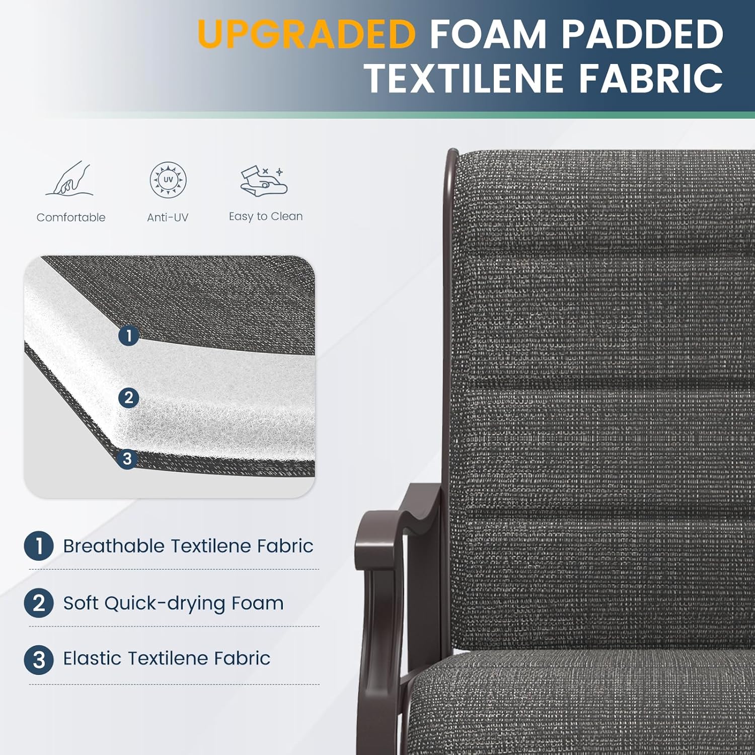 - 【COMFORTABLE PADDED TEXTILENE FABRIC】Our swivel patio chairs are made from a unique padded textile fabric that makes them softer and more comfortable than ordinary chairs while ensuring good breathability. You'll love the soft touch and the comfort of sitting for long periods of time without pains!