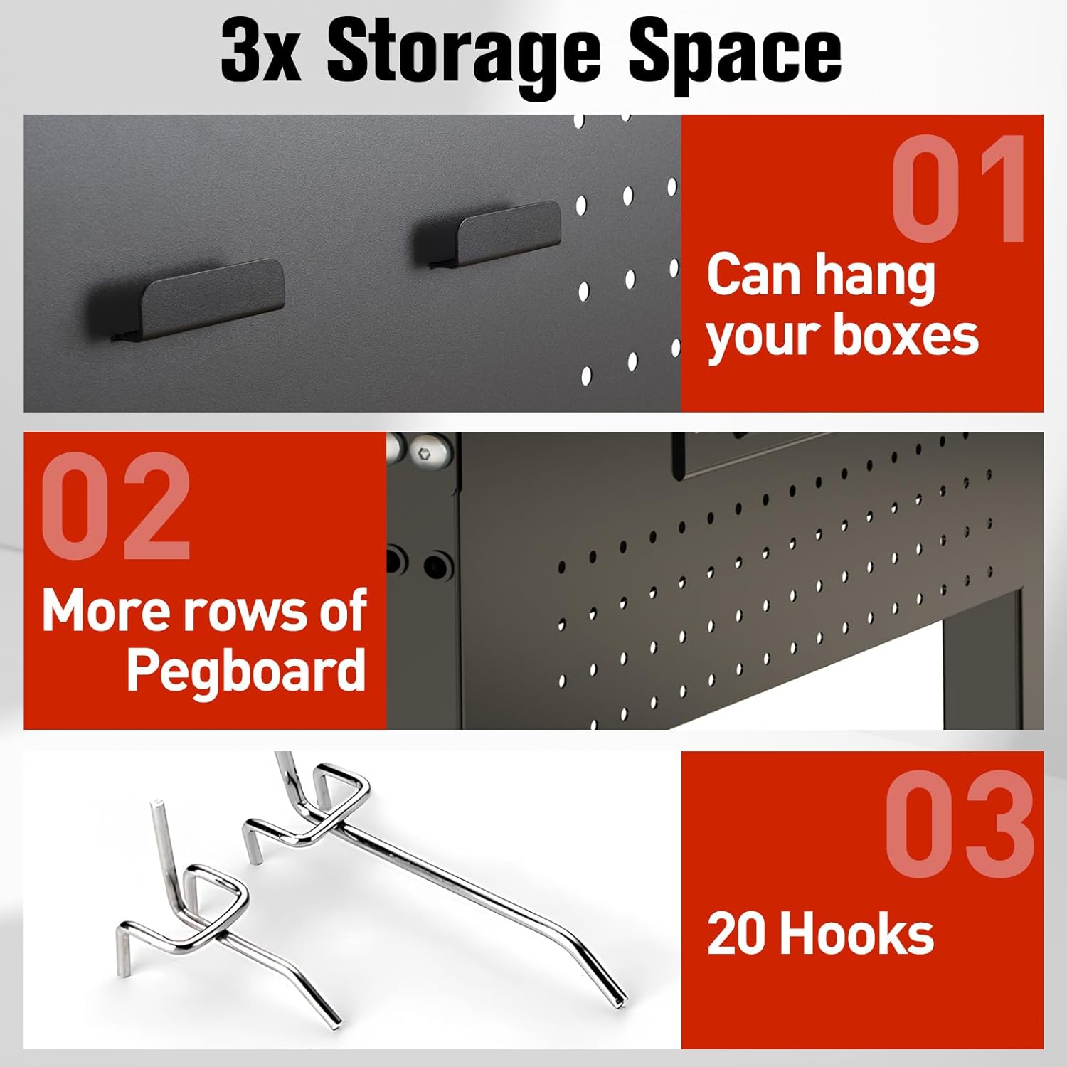 - Pegboard for Organization: A portion of the pegboard is purposely made to hang boxes, allowing you to organize all kinds of small parts. The spacious pegboard has multiple holes, perfect for neatly storing and hanging tools. The pegboard next to the outlets also has a few more rows than other tables, thus not interfering with the outlets. Keep your workspace organized and your tools easily accessible.