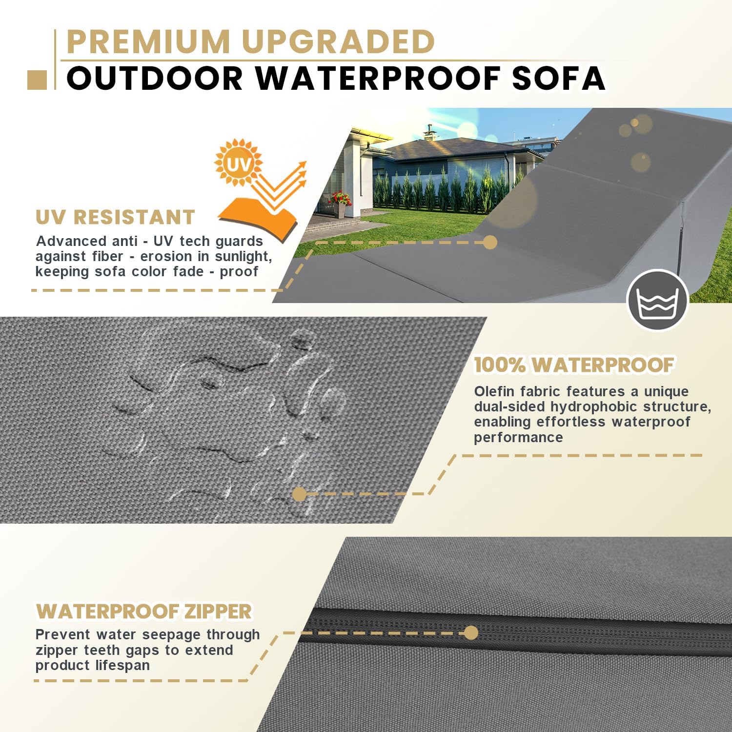 - Waterproof & Stain-Proof Olefin Fabric:Our lounge chair outdoor, crafted from durable Olefin Fabric with a unique double - sided hydrophobic structure, excel in waterproofing and stain resistance. Stains wipe away effortlessly, restoring the chairs' fresh look. This patio furniture repel heavy rain without a trace, dry twice as fast as regular outdoor fabrics, and resist UV fading, ensuring lasting beauty for all your outdoor relaxation needs.