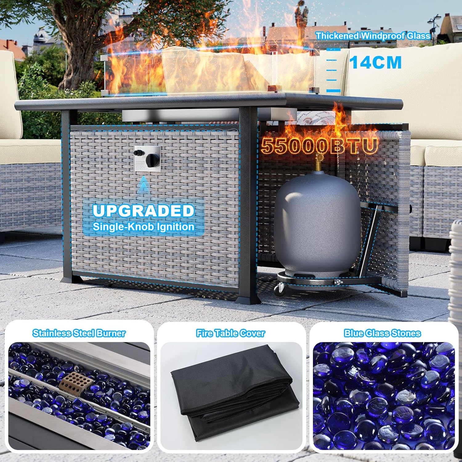 - Upgraded Fire Pit:This fire pit table provides powerful 55000 BTU heat, creating a warm and inviting outdoor atmosphere for any gathering.The upgraded single-knob ignition system makes it easy to ignite and adjust the flame with precision and simplicity.