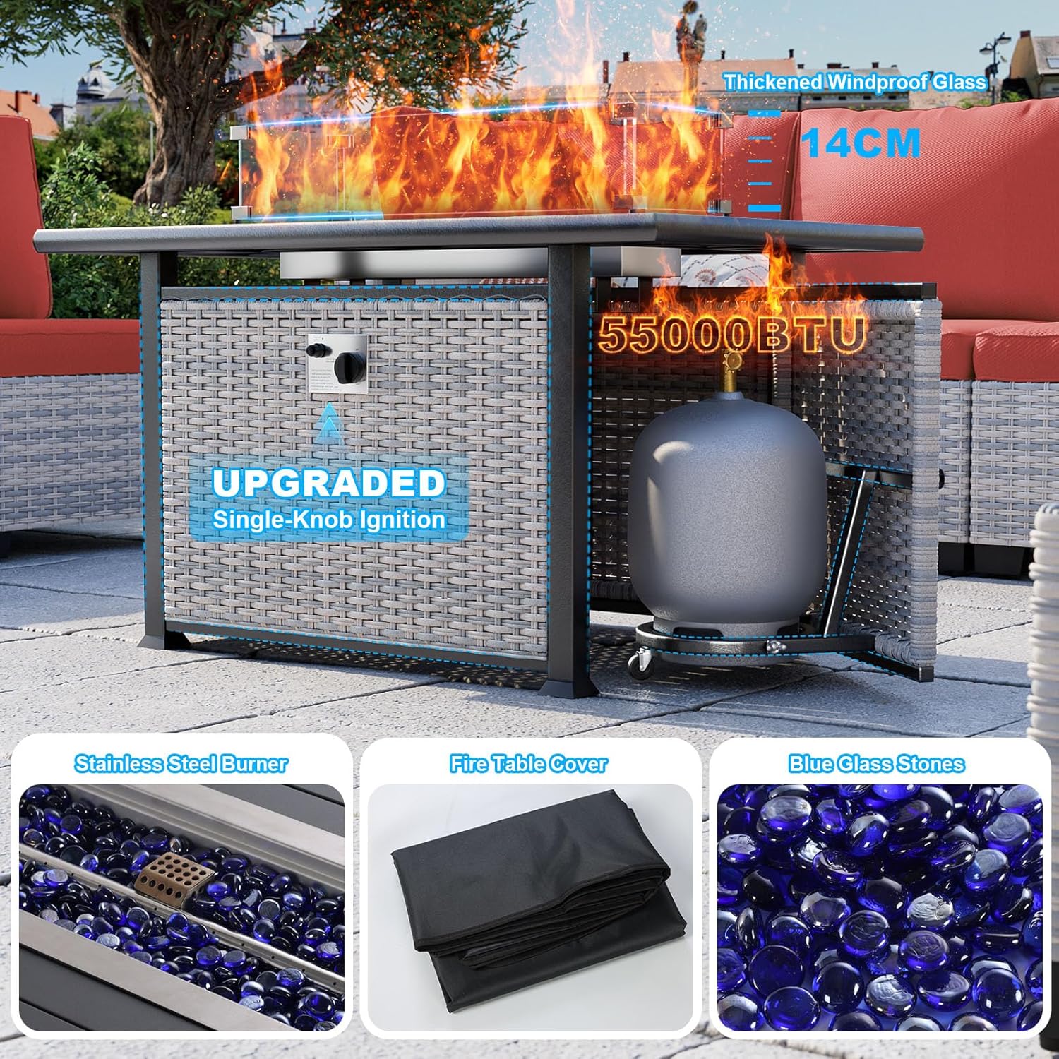 15-Piece Patio Furniture Set, Outdoor Patio Furniture with 55,000 BTU Fire Pit Table, Thick Cushions, Modular Patio Sofa, Dual-Strand Wicker Rattan, Rust-Resistant Frame, Red