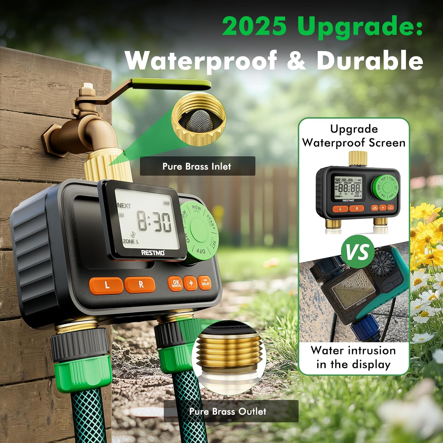 RESTMO RF Remote Controlled Sprinkler Timer with Brass Inlet & Outlet, Water Timer for Garden Hose, Automatic/Manual/Rain Delay for Outdoor Faucet, Drip Irrigation and Lawn Watering, 2 Outlet