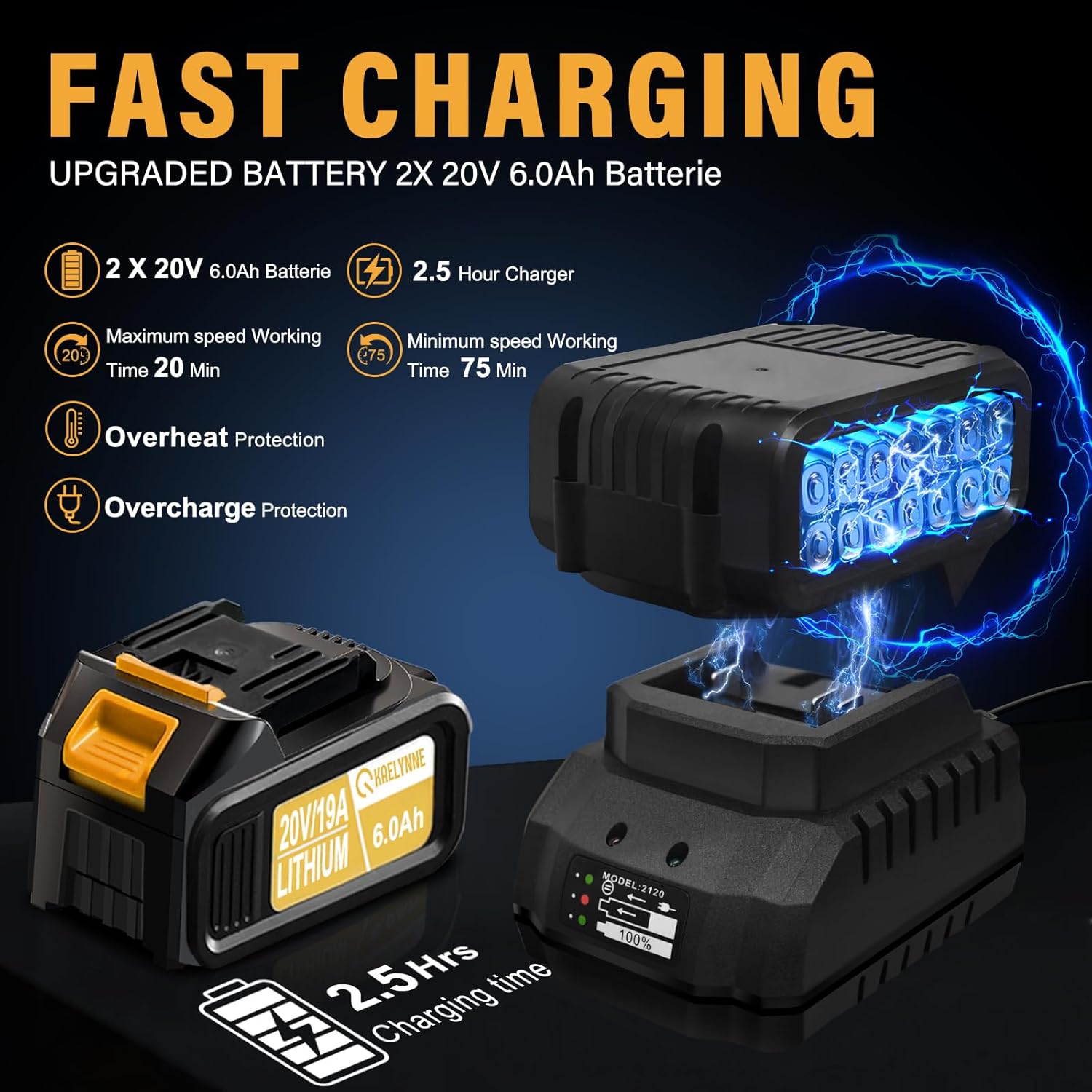 - 【Long-lasting Battery】Kaelynne electric leaf blower comes with two 20V-6.0Ah batteries and a fast charger, which meets UL safety test standards. After fully charged, the two batteries can be used for 20 minutes at maximum power and 60 minutes at medium power.