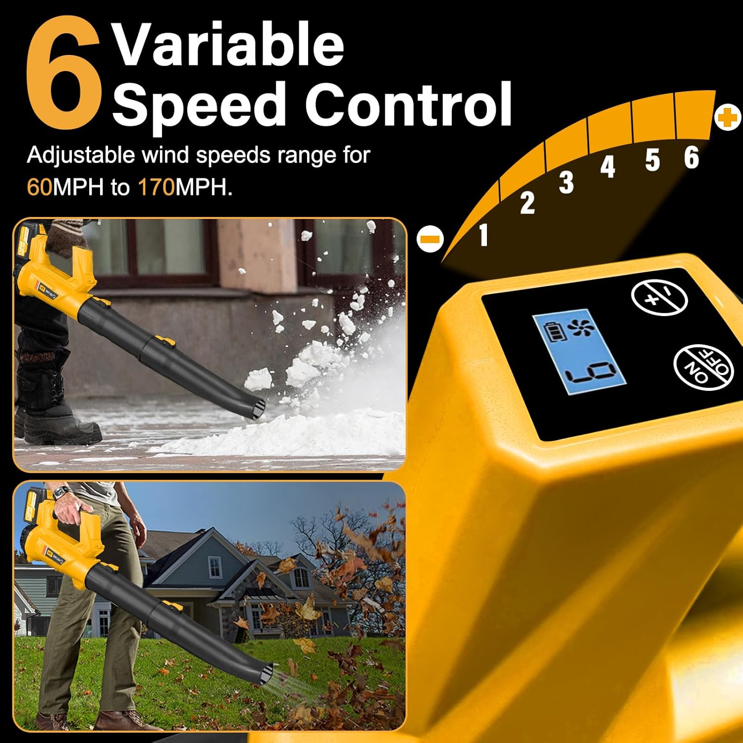 - 【Powerful Motor & 6 Speed Mode】Kaelynne cordless leaf blower adopts advanced brushless powerful motor technology, which can provide high torque, high power and long life. No-load speed: 20000 r/min. 6 wind speeds. Up to 540CFM and 170 MPH, the leaf blower can efficiently help you clean the target area. It can be assembled in a few minutes, just install 2 nozzles and 1 battery to start the leaf blower.