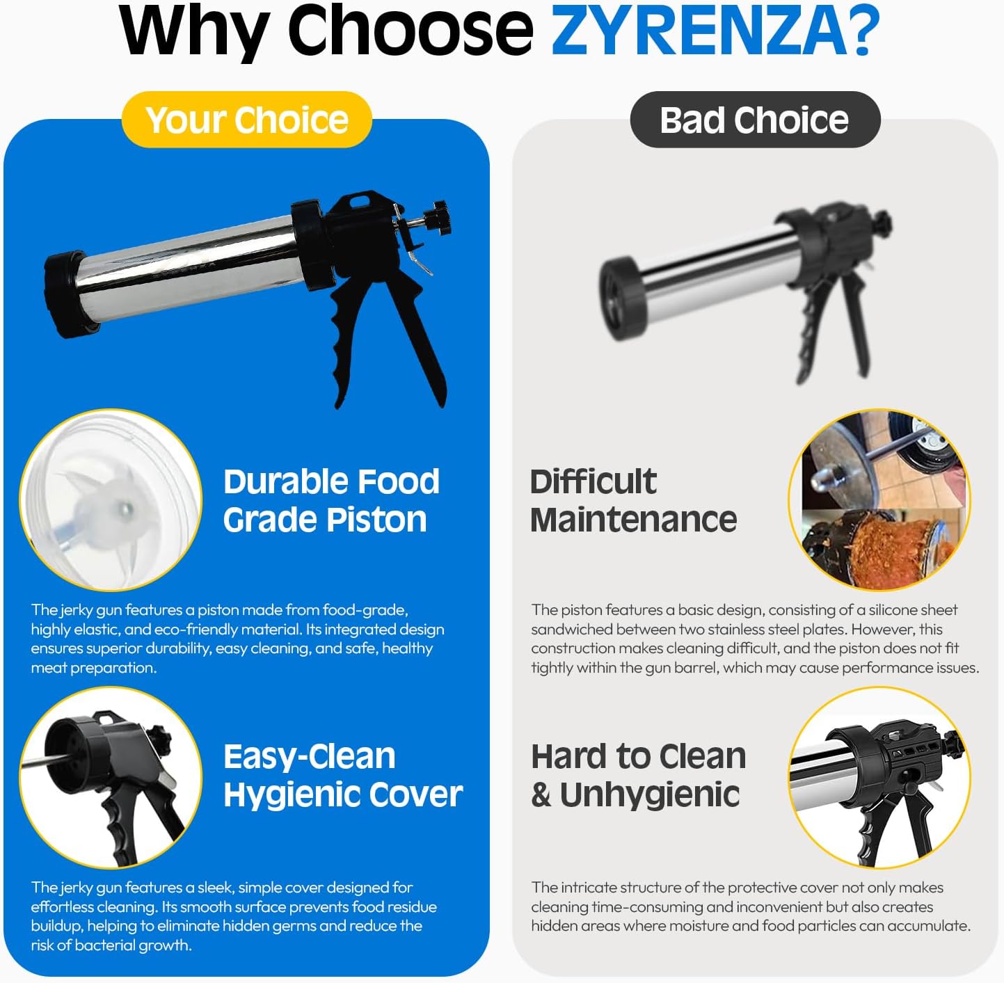 - ALL-IN-ONE BEEF JERKY MAKER & BEEF JERKY GUN KIT It comes with everything you need to get started: 5 nozzles, 5 cleaning brushes (2 sets), 1 meat pusher, and gloves. ZYRENZA beef jerky maker kit turns meat prep into a simple, satisfying task. It is ideal for anyone looking for a complete beef jerky gun kit.