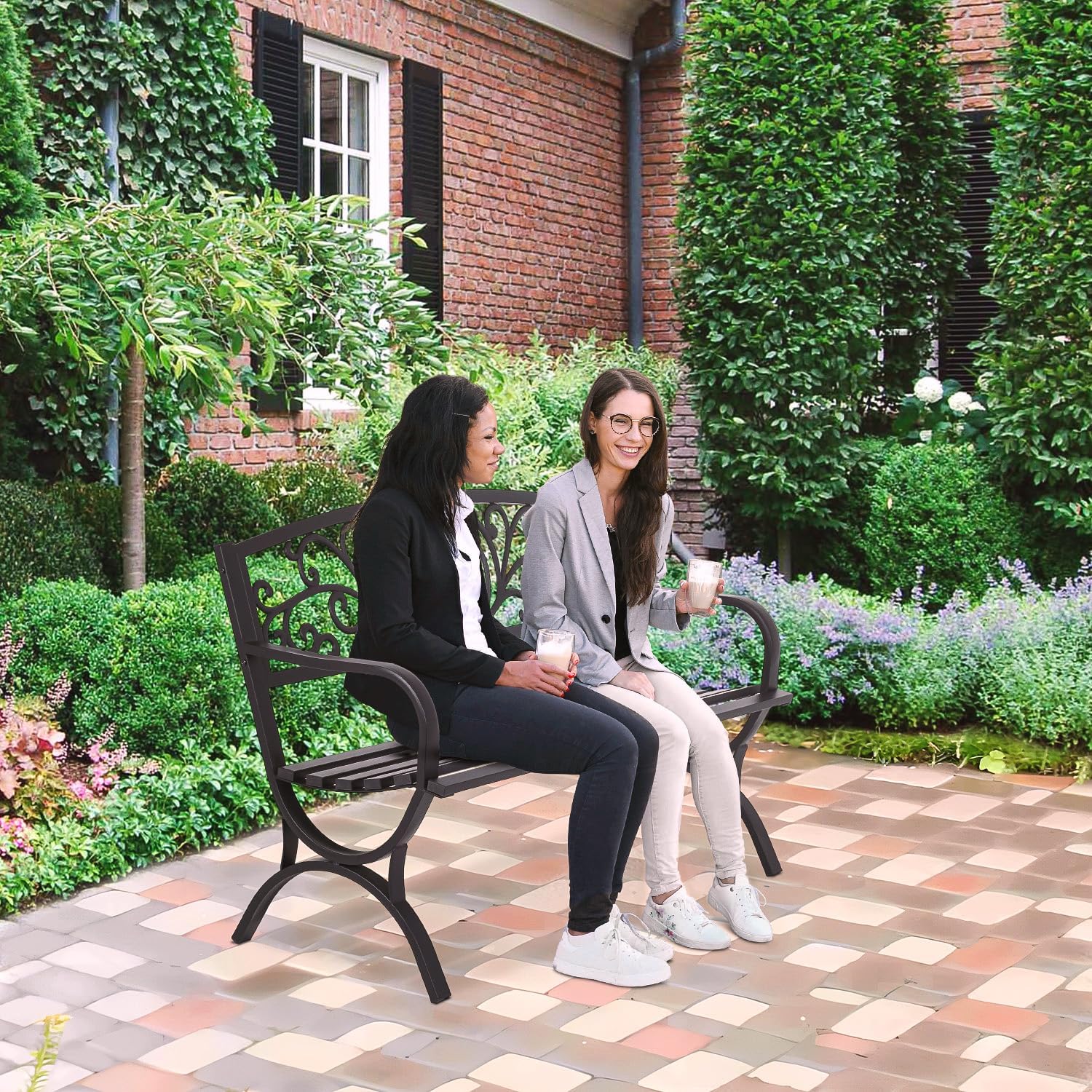 - Sturdiness: The Park Bench is made of reinforced steel to ensure sturdiness and stability, durable and the Metal Bench perfect for use for years.The Garden Bench is powder coated with rust-resistant finish, super smooth. The bench comfortably seats two adults and bears weight to 485 lbs.