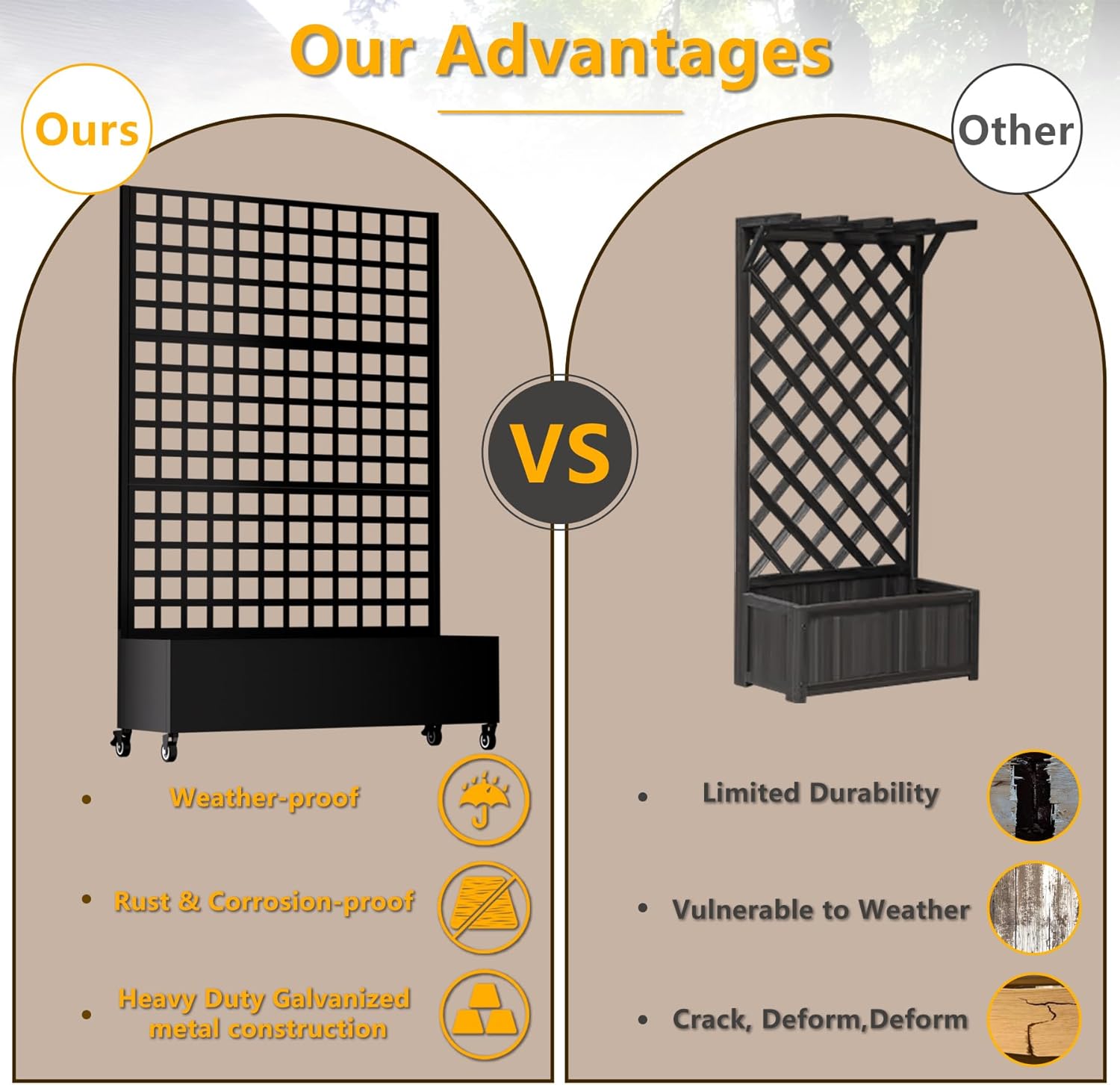 - 【Weather-Resistant Galvanized Steel Structure】Built from premium galvanized metal with multi-layer rustproof coating, this metal planter box with trellis withstands outdoor elements. Its weighted base ensures superior stability and long-lasting durability, making it ideal for year-round outdoor use.