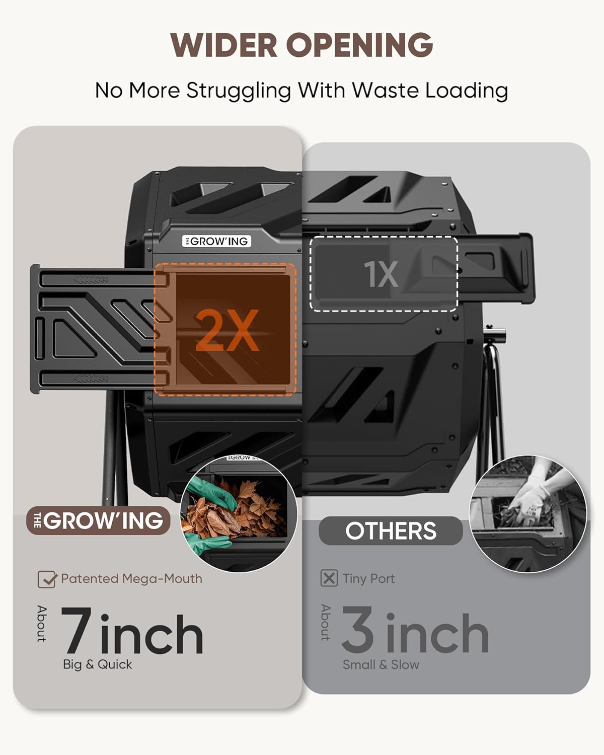 - Fast Aeration & Mixing – Ready in Weeks: Internal air vents ensure proper oxygen flow, helping your scraps break down faster. With the built-in compost turner design, all you need is a spin to mix the contents. Combined with its heat-absorbing black and brown exterior, this tumbler compost bin speeds up the composting cycle naturally. Whether you’re a beginner or a pro, it’s a reliable outdoor compost bin tumbler or compost barrel that gets the job done fast.