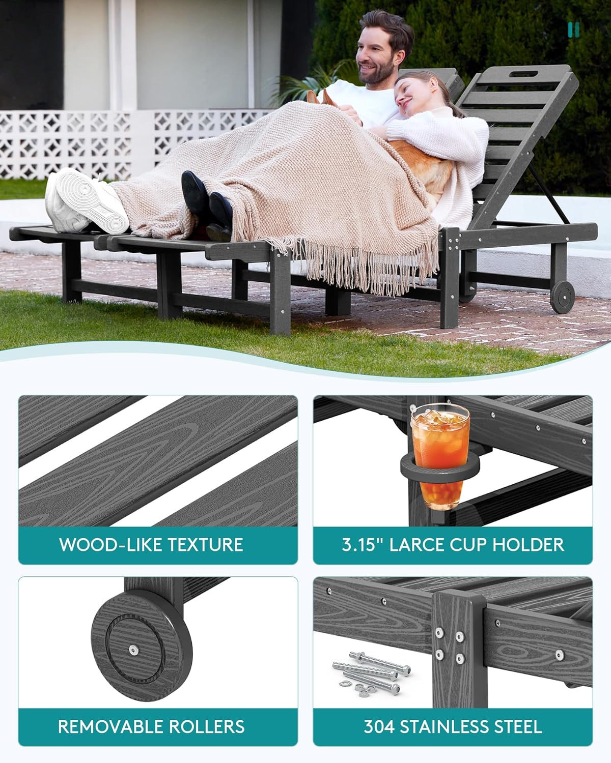 - All Weather Use: Designed to withstand rain, sun, and wind, this outdoor chaise lounge chair features a wood-grain HDPE(High Density Polyethylene) frame and 304 stainless steel screws, ensuring long-lasting performance without fading or rusting. This resin lounge Chair is the perfect companion for your outdoor life