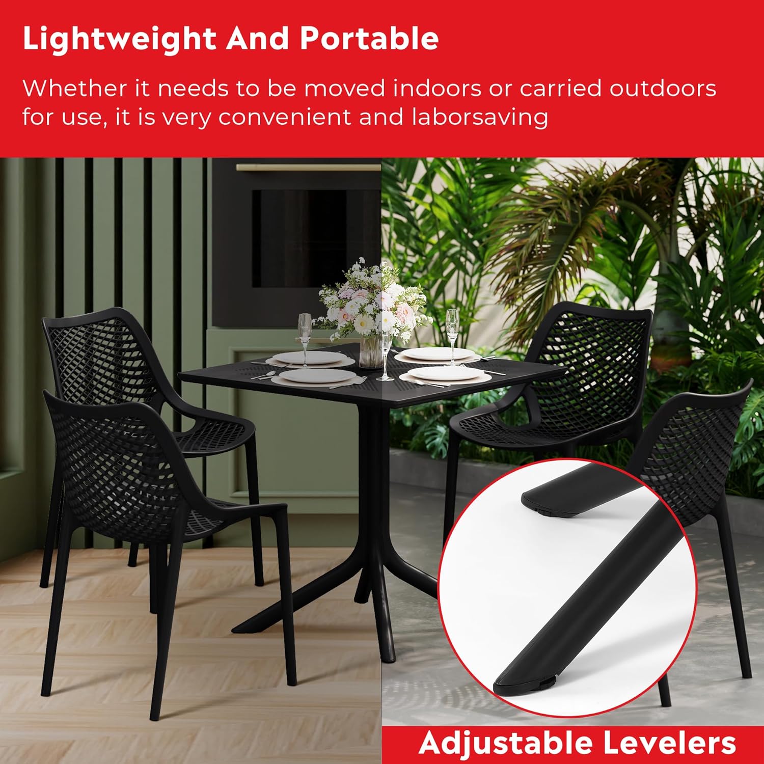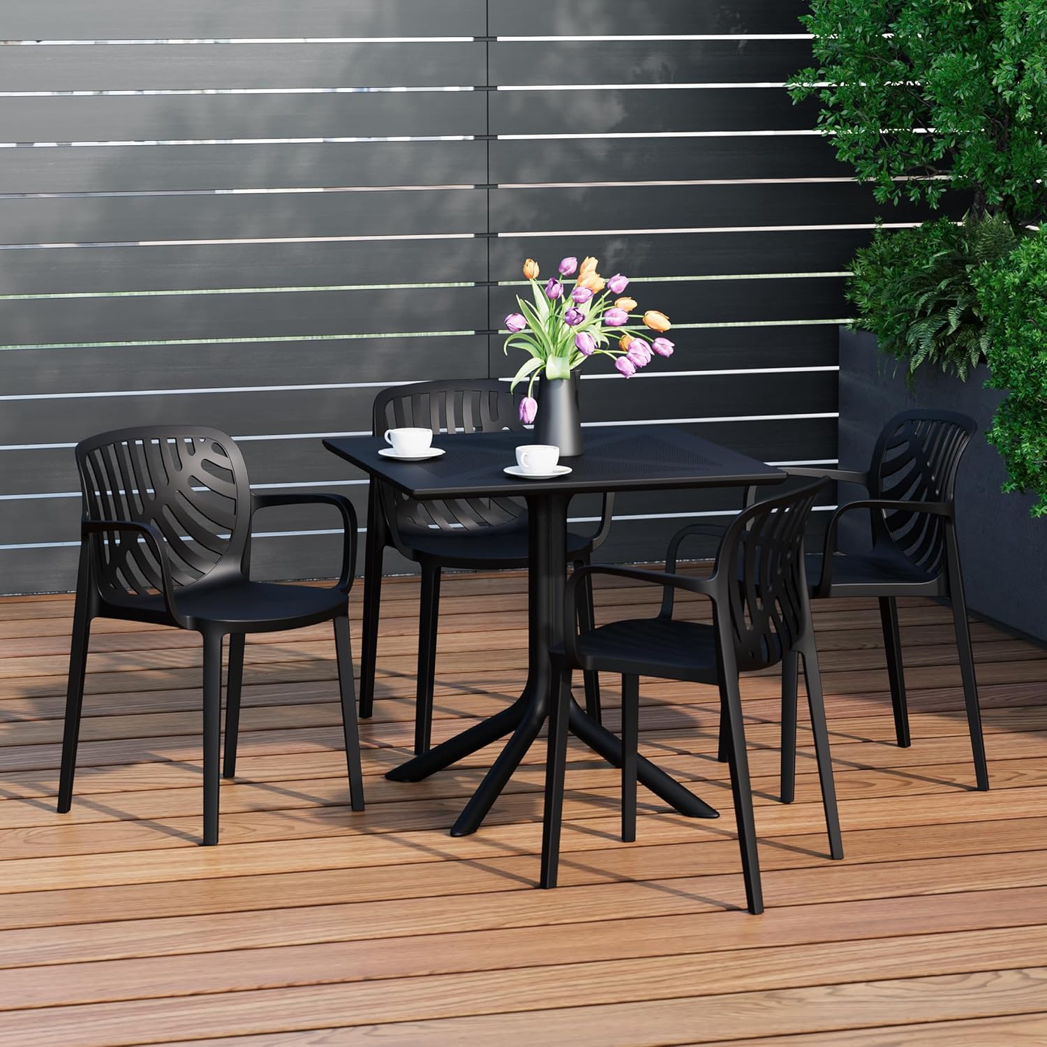 Breakfast Table Set for 4, HDPE Patio Square Dining Table and Stackable Chairs, Outdoor Small Patio Furniture Set All Weather for Backyard Porch Poolside, Black