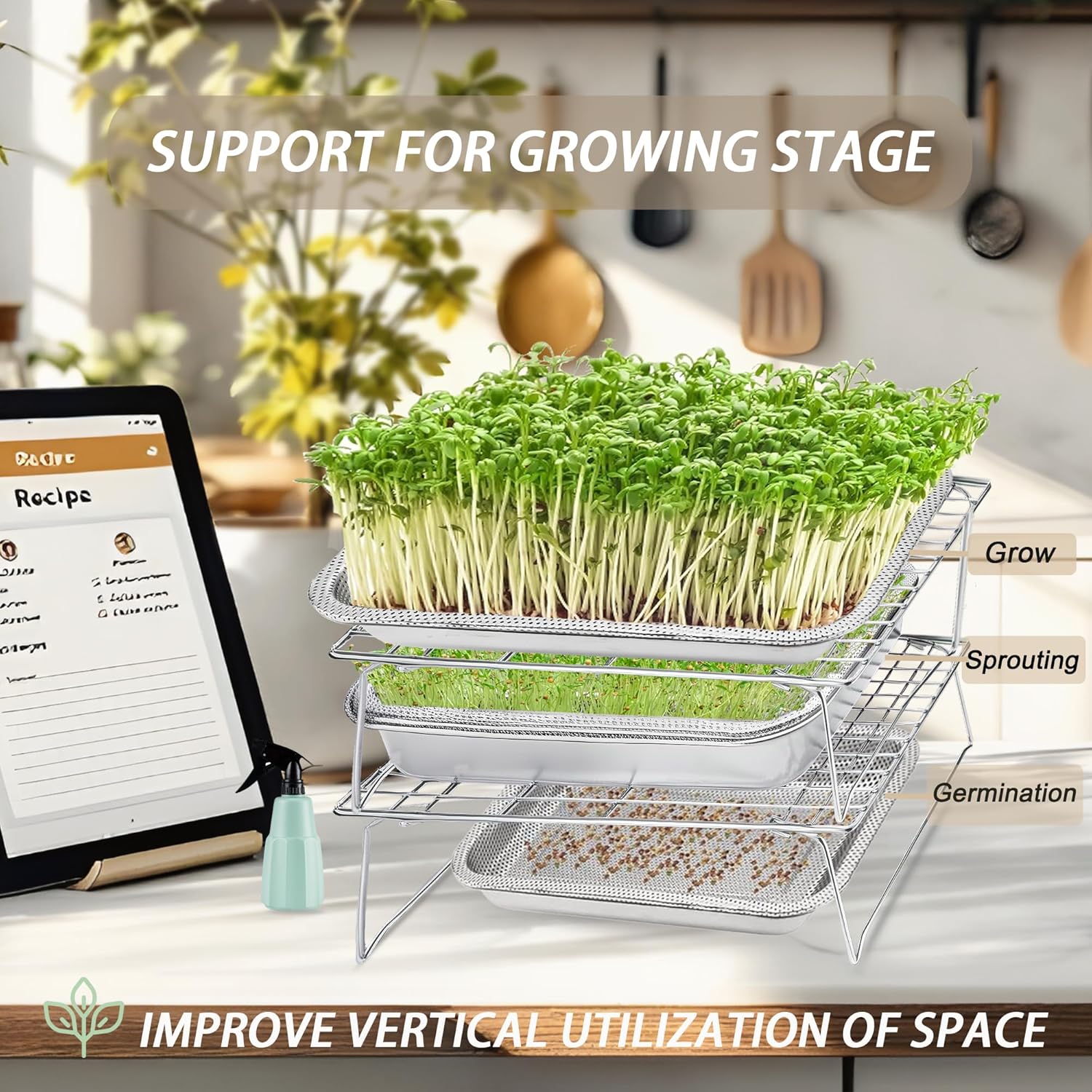 - Sturdy and Foldable Sprouting Tray Metal Plant Stand: Heavy-duty iron frame with rust-proof coating securely holds 4.2"H sprouting trays, 14"L x10"W compatibility. With clamps lock trays for stable germination, designed for indoor kitchen use, eliminating clutter while ensuring durability