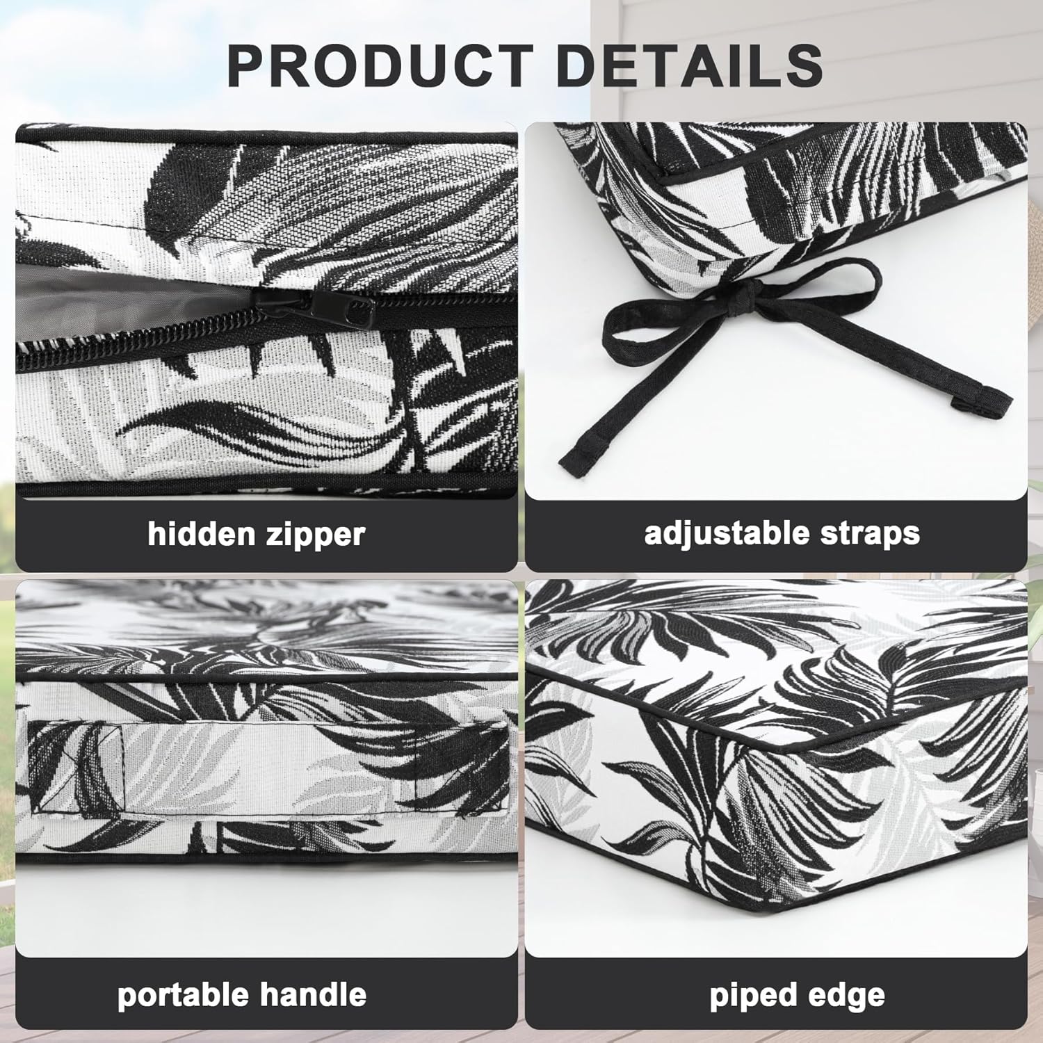 - Details - Removable cover makes the cushion easy to clean, machine and hand washable. Two adjustable straps help secure the cushion and prevent sliding. Portable handles make the cushion easy to carry and piped edges help to keep its original shape.