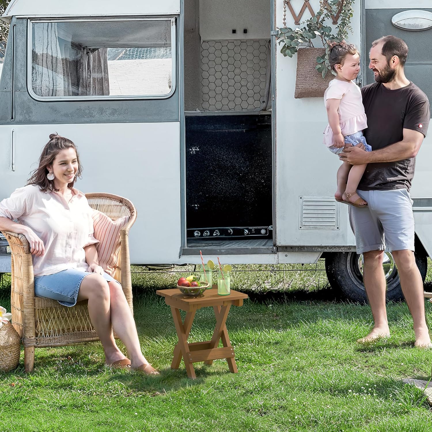 LUE BONA Small Outdoor Folding Side Table, HDPS Outside End Table for Patio, Porch, Deck, Pool, 14 Inch Height, Teak Color Oil Printed