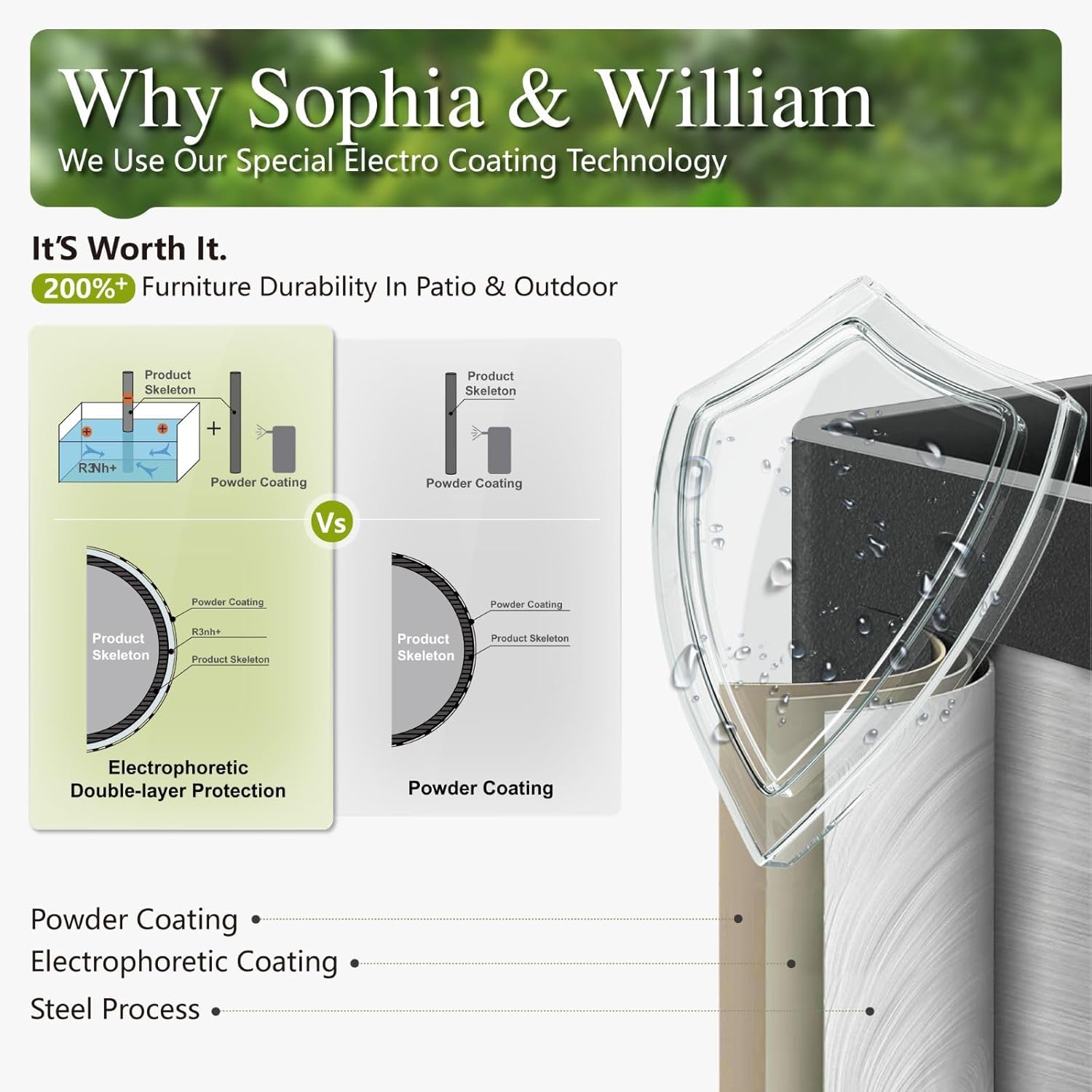 - All-weather Resistant: Enhance your outdoor living space with the Sophia & William modern patio furniture set . Built to withstand all weather conditions, this outdoor furniture boasts a thicken steel frame with E-coating for excellent rust-proof ability and long-lasting durability. Durable steel tube adds stability and weight capacity up to 350 lbs(single sofa chairs), ensuring a luxurious outdoor experience for you and your guests