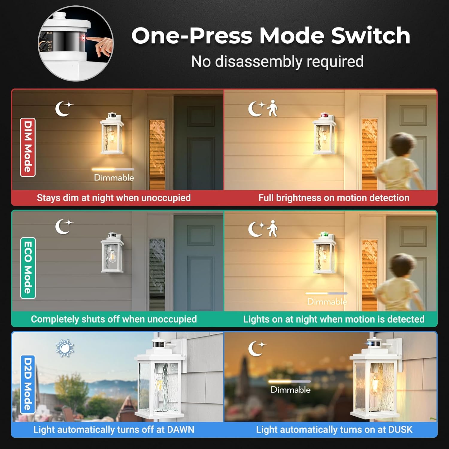 - [One-button Mode Switching & Dual Knob Setting] You can easily switch to ECO or DIM or D2D mode at any time with a touch of the sensing button, and the motion sensors of outdoor lanterns for porch remember your last setting. In addition, you can adjust the porch lights outdoor sensors' detection range or the lighting holding time just by turning a knob. It's easy to enjoy smart, energy-efficient living without having to understand complicated programs.