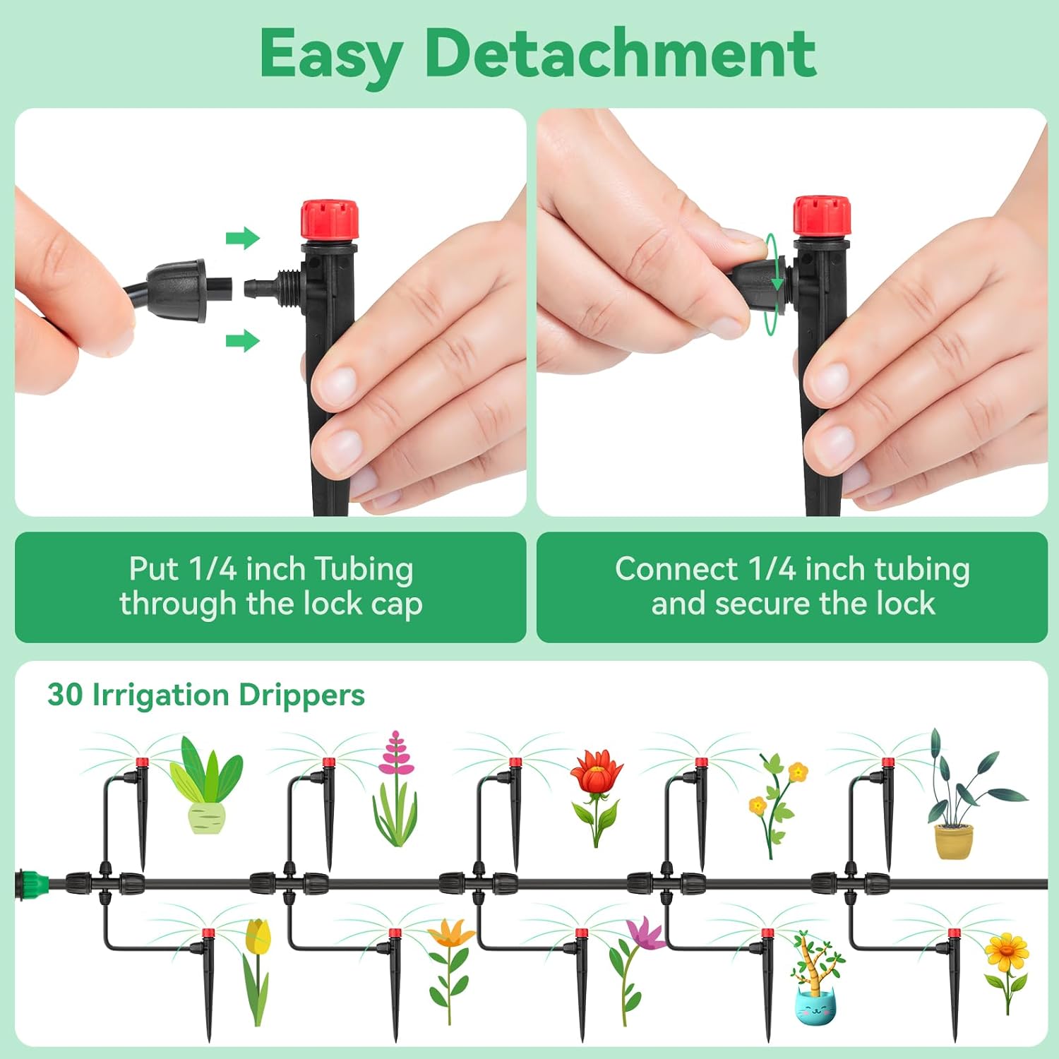 - Upgraded Design:The drip irrigation emitters with lock barbed design,No need to use hot water to soft the connection tubing.The lock barbed nut keep the drip line more secure for your garden plants watering