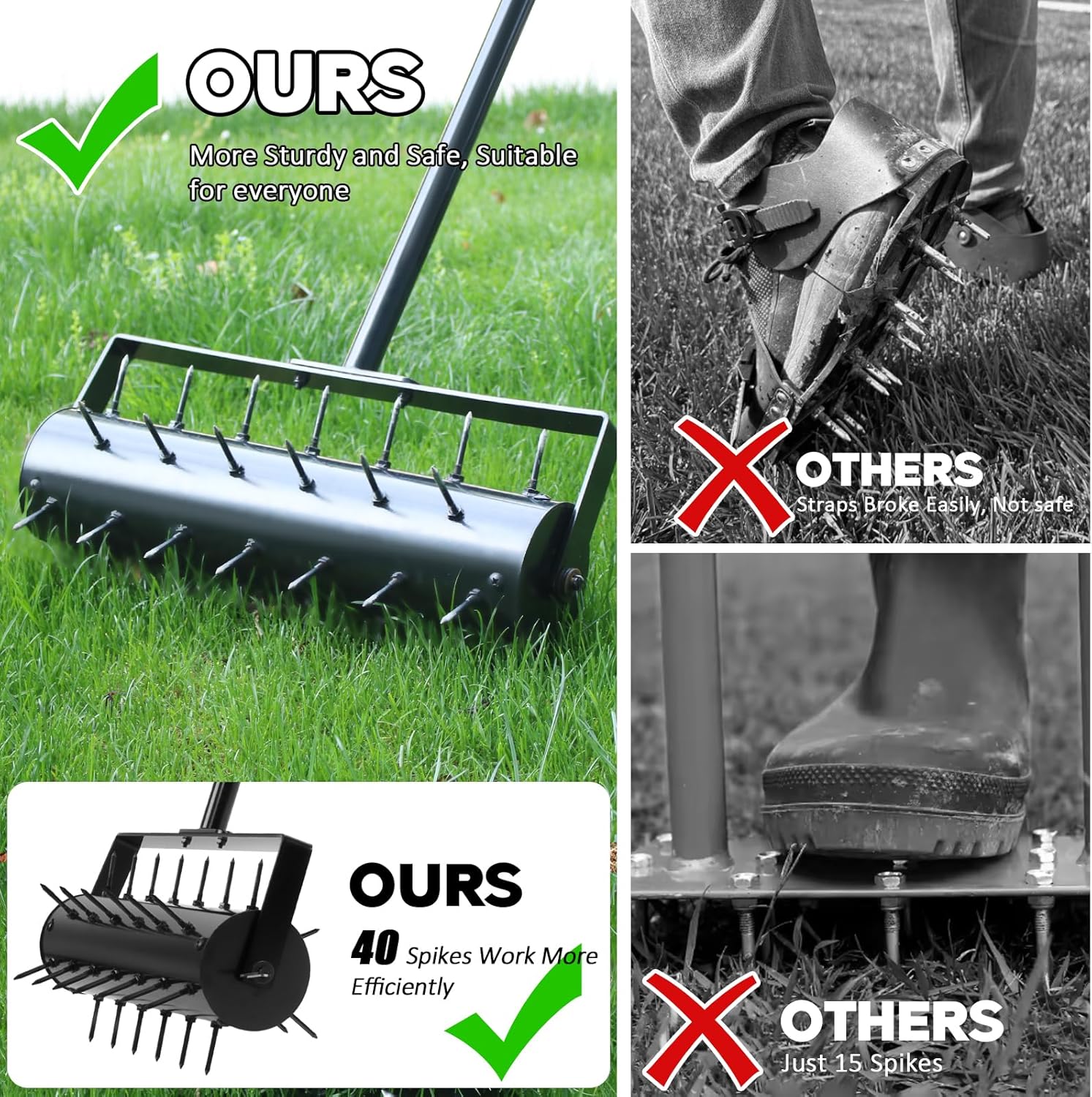 - Easy to Use & Time-Saving - Simply push the rolling aerator across your lawn to aerate with ease. The wide spike drum covers more ground in less time, saving effort while delivering professional-grade results.