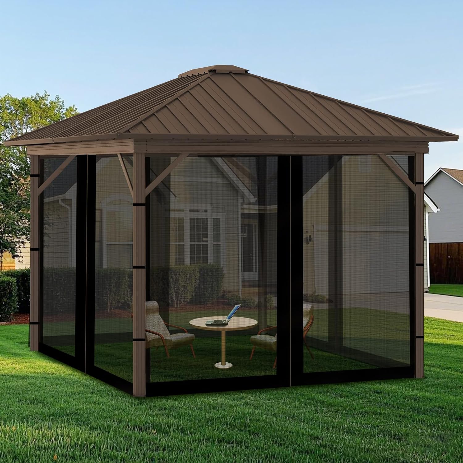 - 【High Quality Material】The gazebo mosquito netting is made of durable polyester fabric. It is UV - resistant ,breathable and NFPA 701 certified for flame retardancy.With 4 - panel mesh screen walls, it creates a cool, clean, mosquito-free outdoor space for hot summer.