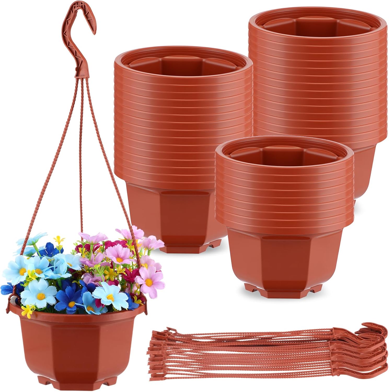 Roshtia 24 Pcs Hanging Plastic Planter Pot with Hook Flower Pots Baskets Hanging Nursery Planter Holder for Outdoor Indoor Plant Garden(Brown,6 Inch)