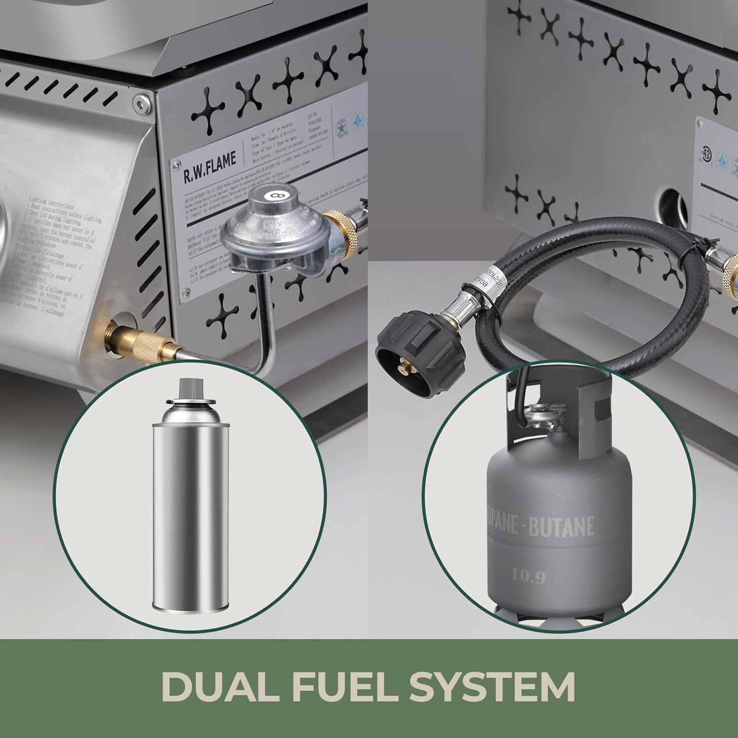 - Removable griddle and stainless steel grille: Versatility for convenience, grill on a durable stainless steel cooking grill, or switch to a non-stick pan for pancakes, fried eggs, or stir-fries.Easy to clean, uniform heat distribution.Very suitable for family outdoor camping and barbecue