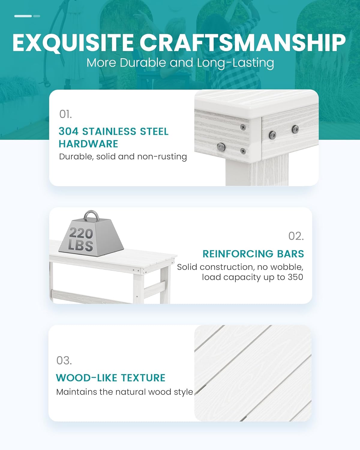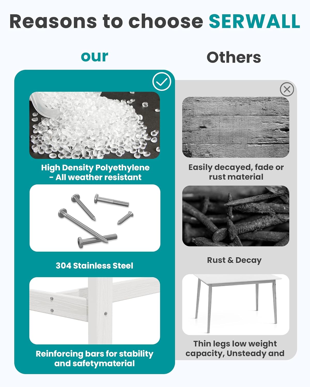 - Sturdy and Durable: Serwall outdoor furniture crafted from recyclable HDPE (High-Density Polyethylene), this material is built to withstand extreme weather conditions, including intense sun, freezing temperatures, strong winds, and heavy rain, all while maintaining its original color.