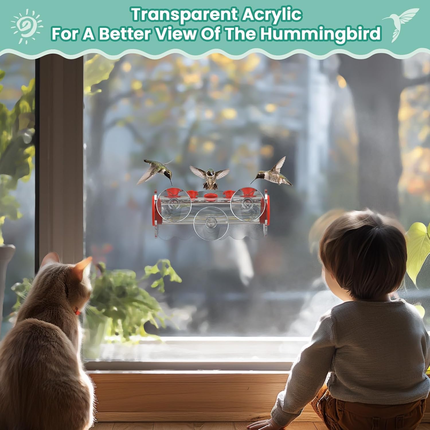 - 【No-Mess Design】Advanced leak-proof seal technology prevents nectar dripping. The vacuum base with 3 industrial-strength suction cups stays firmly attached to glass in all weather conditions. Removable acrylic body for easy filling water and cleaning.