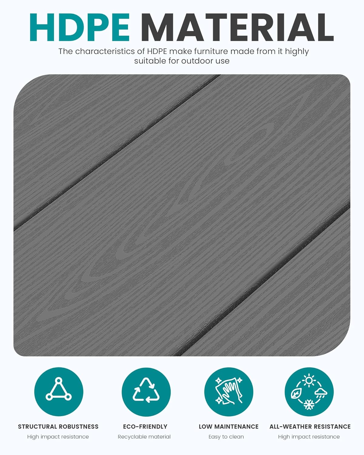 - Premium HDPE Material: Made from all weather HDPE with a wood-grain texture, this table is designed to withstand the elements while adding a stylish touch to your patio or garden