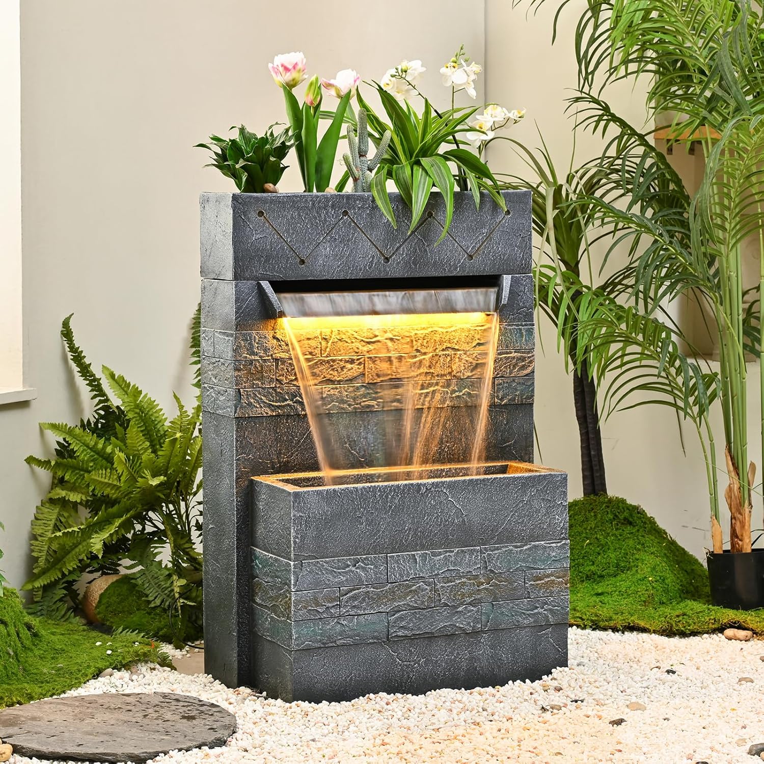 34.65'' Outdoor Garden Cascading Stone Floor-Standing Waterfall Fountain with LED Lights for Patio, Backyard, Deck, Porch and Home Art Decor