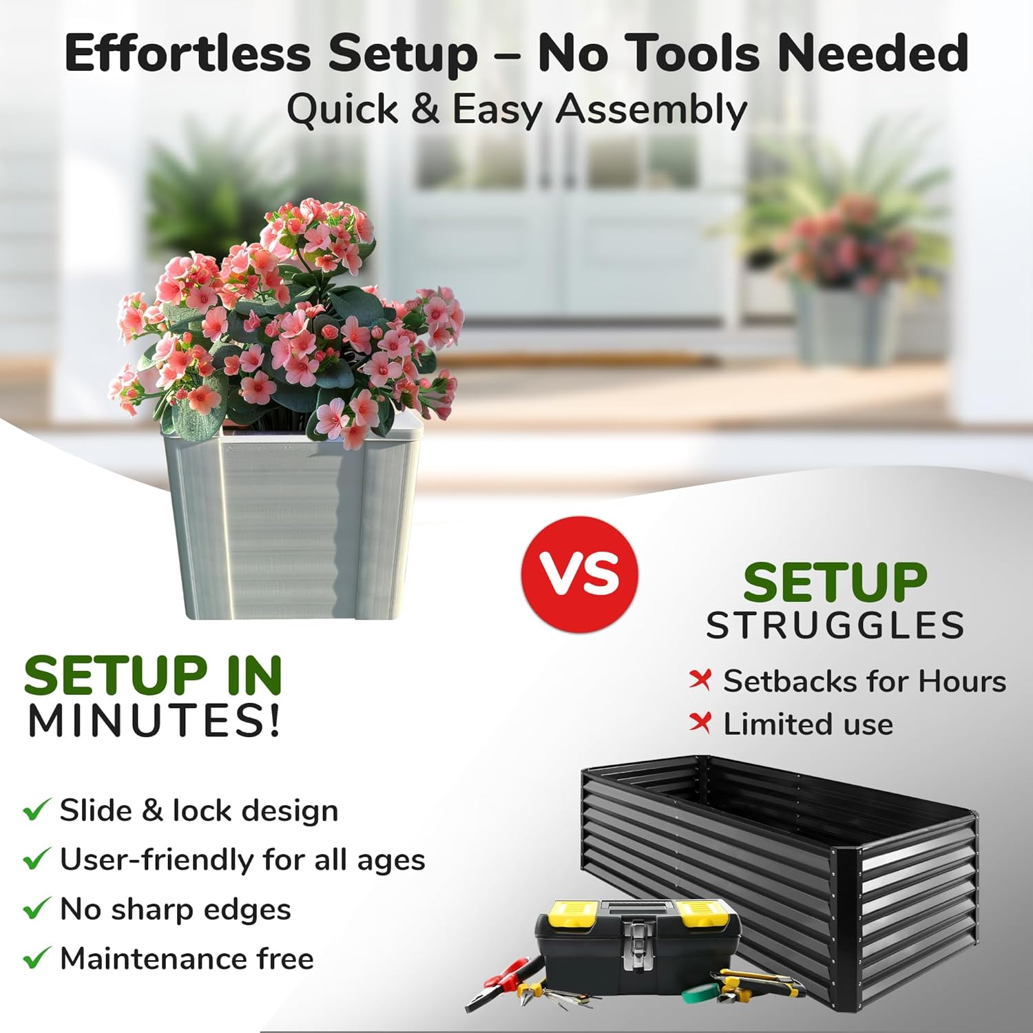 - EASY ASSEMBLY, NO TOOLS REQUIRED: With a snap-together design, setting up your garden bed takes just minutes! No screws or tools necessary, making this a hassle-free choice for busy gardeners looking for a simple and quick setup.