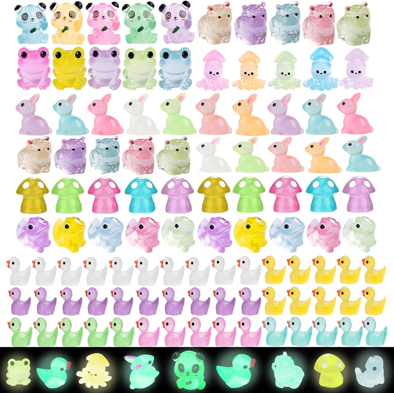 - Various Styles: Come with 120 luminous little animals in different colors, 5 Pandas, 5 Octopus, 10 Alpacas, 5 Frogs, 15 Rabbits, 10 Mushrooms,10 Lizards, 60 Ducks, various of plastic animals can meet your diverse needs.
