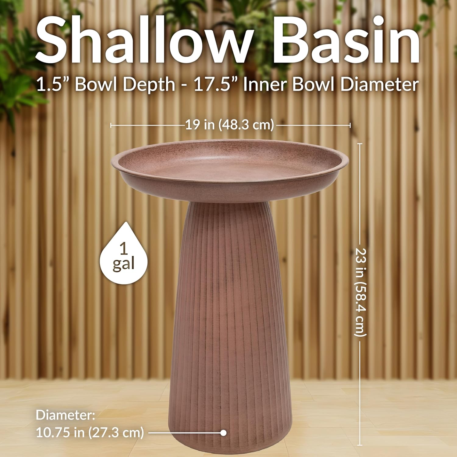 - PERFECT SIZE FOR BIRDS: This large bird bath measures 19" diameter x 23" H. The bowl has a 1.5" bowl depth and holds 1 gallon of water. The base measures 10.75" diameter x 21" H. The outdoor bird bath weighs 7.6 lbs for easy placement.