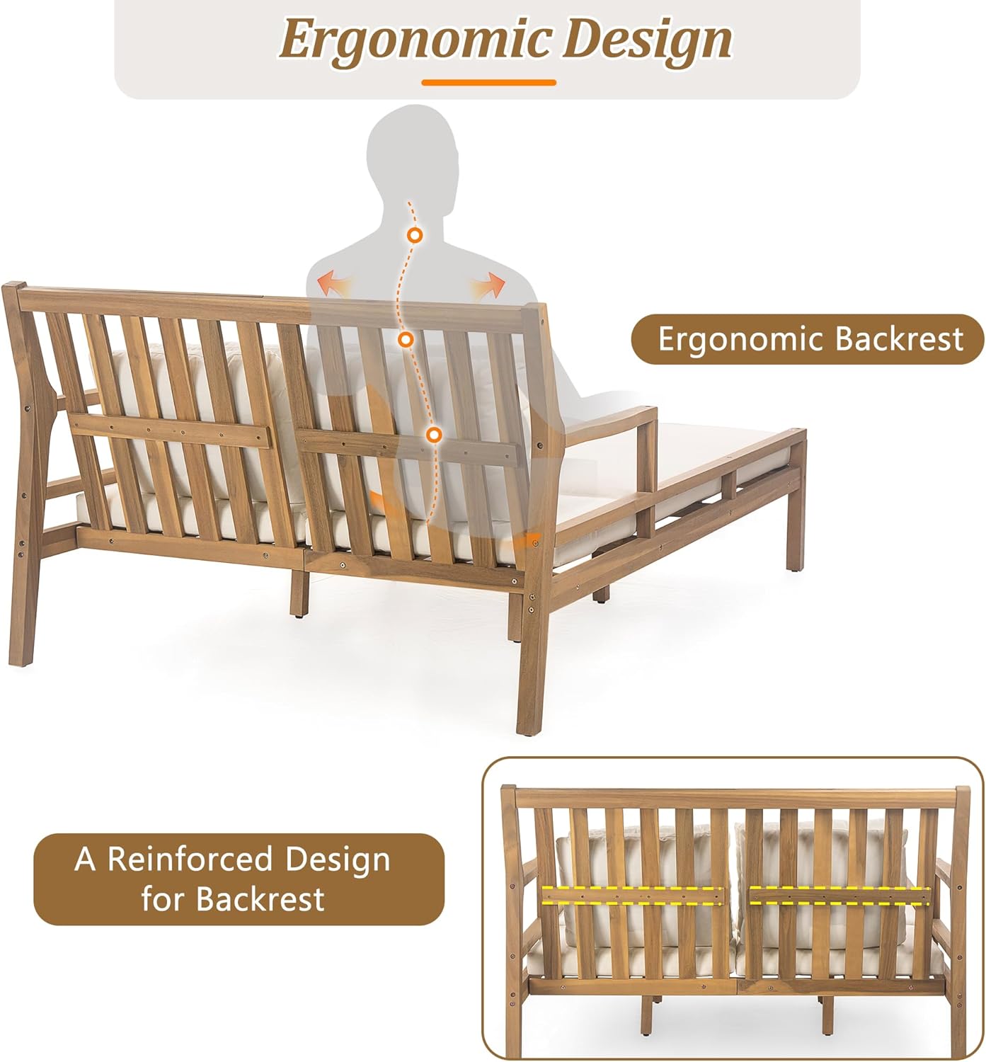 Merax Outdoor Daybed, 3 Seater Acacia Wood Daybed, Patio Day Bed with Four Pillows, Wooden Outdoor Bed with Curved Armrests for Poolside, Backyard, Garden, Light Teak