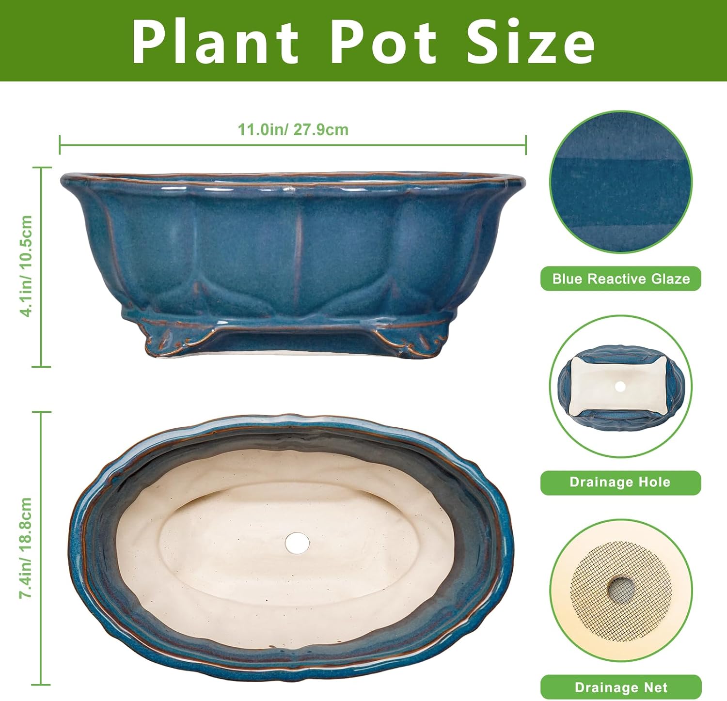 - Planter Size: Our ceramic plant pot is 11.0'' X 7.4'' X 4.1''. Packaging Includes: a ceramic planter, a drainage net. Thoughtfully packaged to ensure your bonsai planter arrives in complete condition