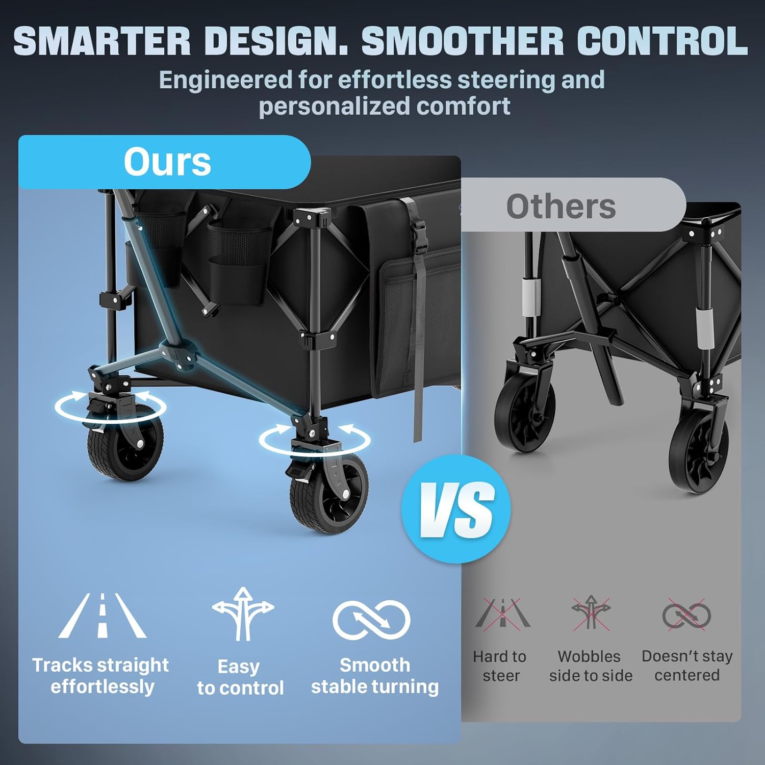 - 【Stable Steering – No Wobble Turns】 Designed for stability, this folding wagon cart with wheels features a reinforced turning system and adjustable handle for smooth control on any terrain. Whether you're navigating tight corners or pushing uphill, the collapsible folding wagon keeps movement steady.