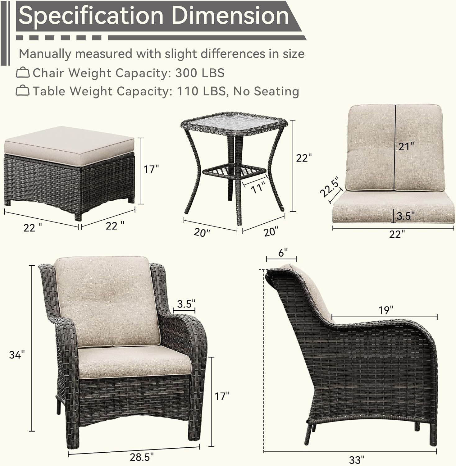 5 Pieces Patio Conversation Set, Wicker Chairs Set of 2 and Two Ottomans with 3.5-inch Seat Cushions, 1 Side Table High Back and Curved Armrest for Backyard, Balcony and Deck, Beige