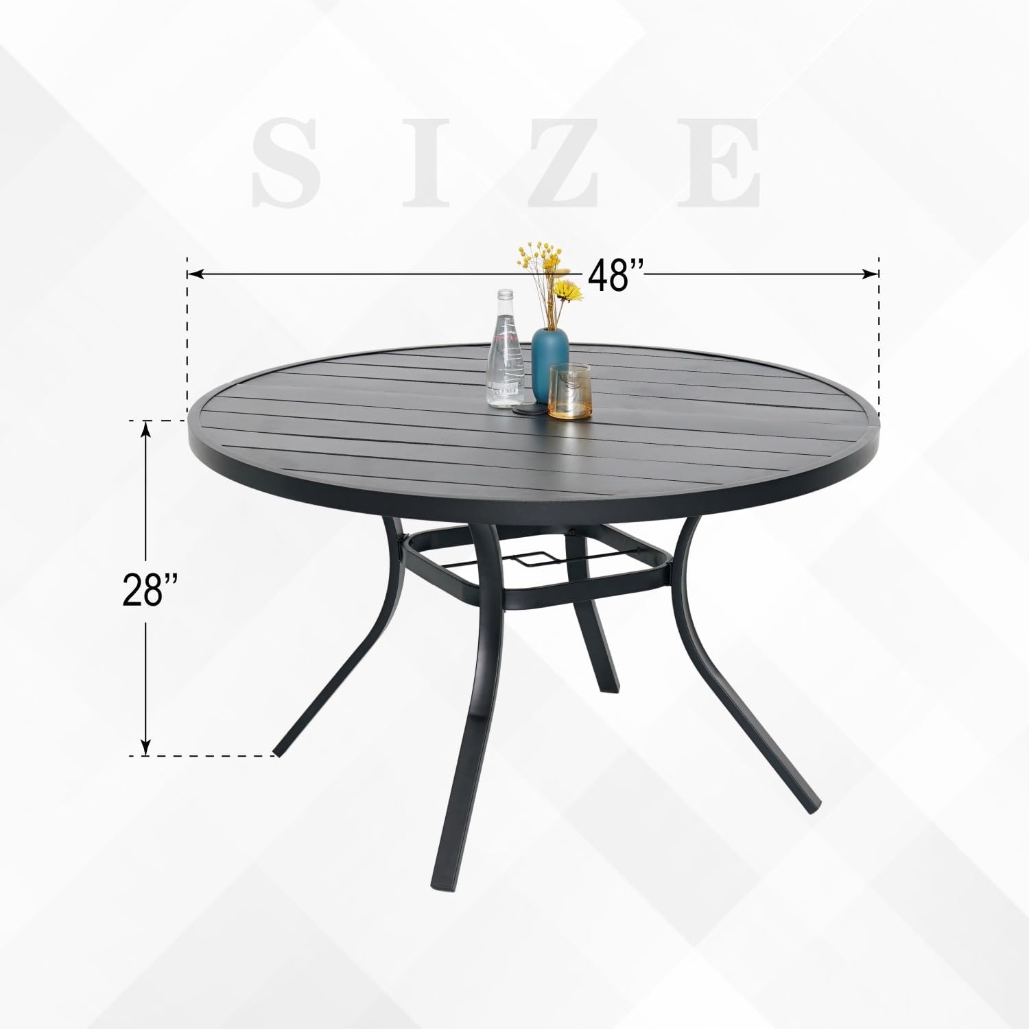 Round Outdoor Dining Table, 48-inch All-Weather Patio Table with Adjustable Umbrella Hole for Deck Lawn Garden Backyard Balcony Deck, Black Metal Frame Slatted Tabletop