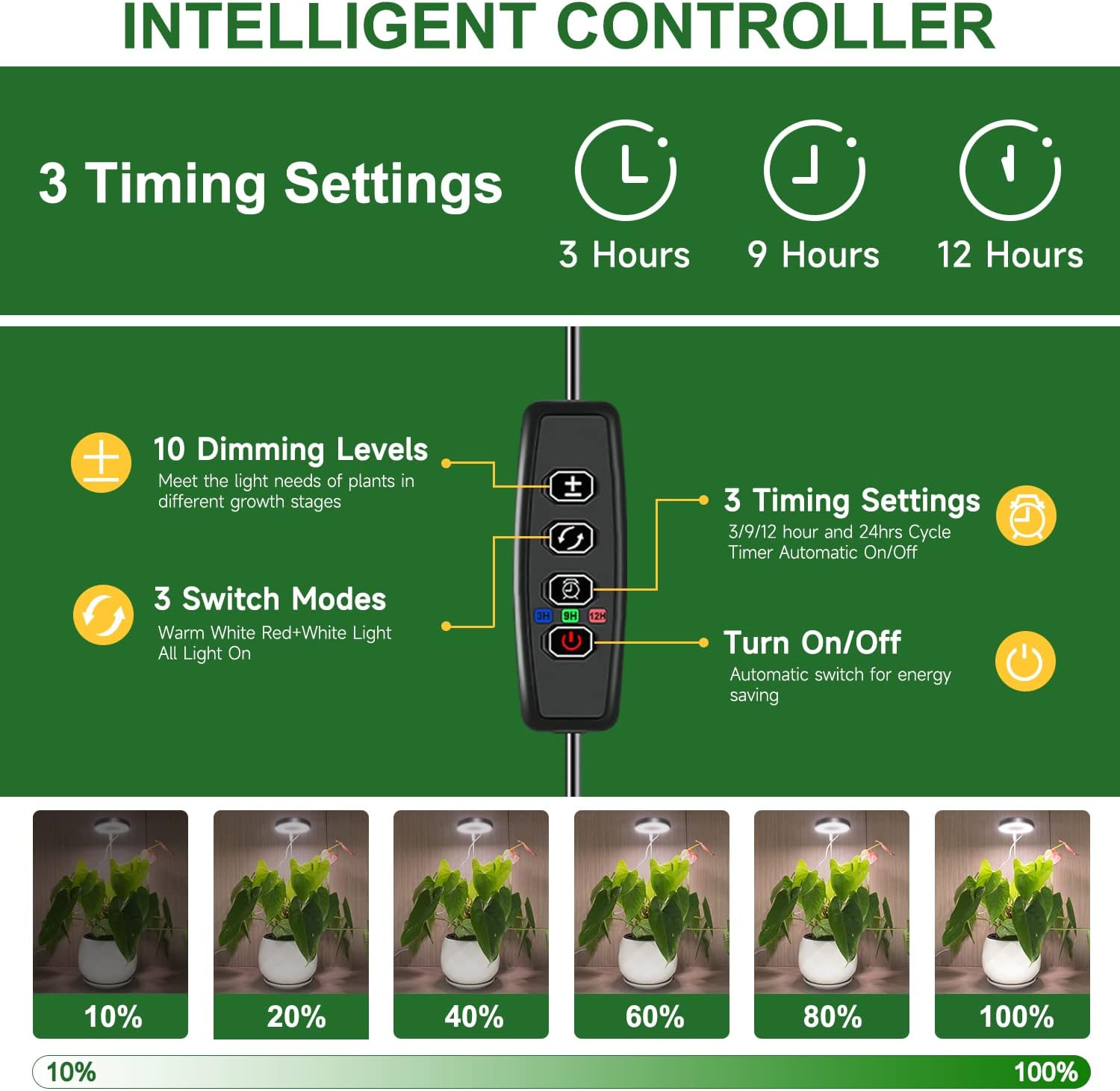- Timer Adjustment: This small grow light have set up timer with 3 modes cycle timing function which stay on for 3H, 9H, 12H. When keeping power, it can automatically turn on and off every day according your settings.