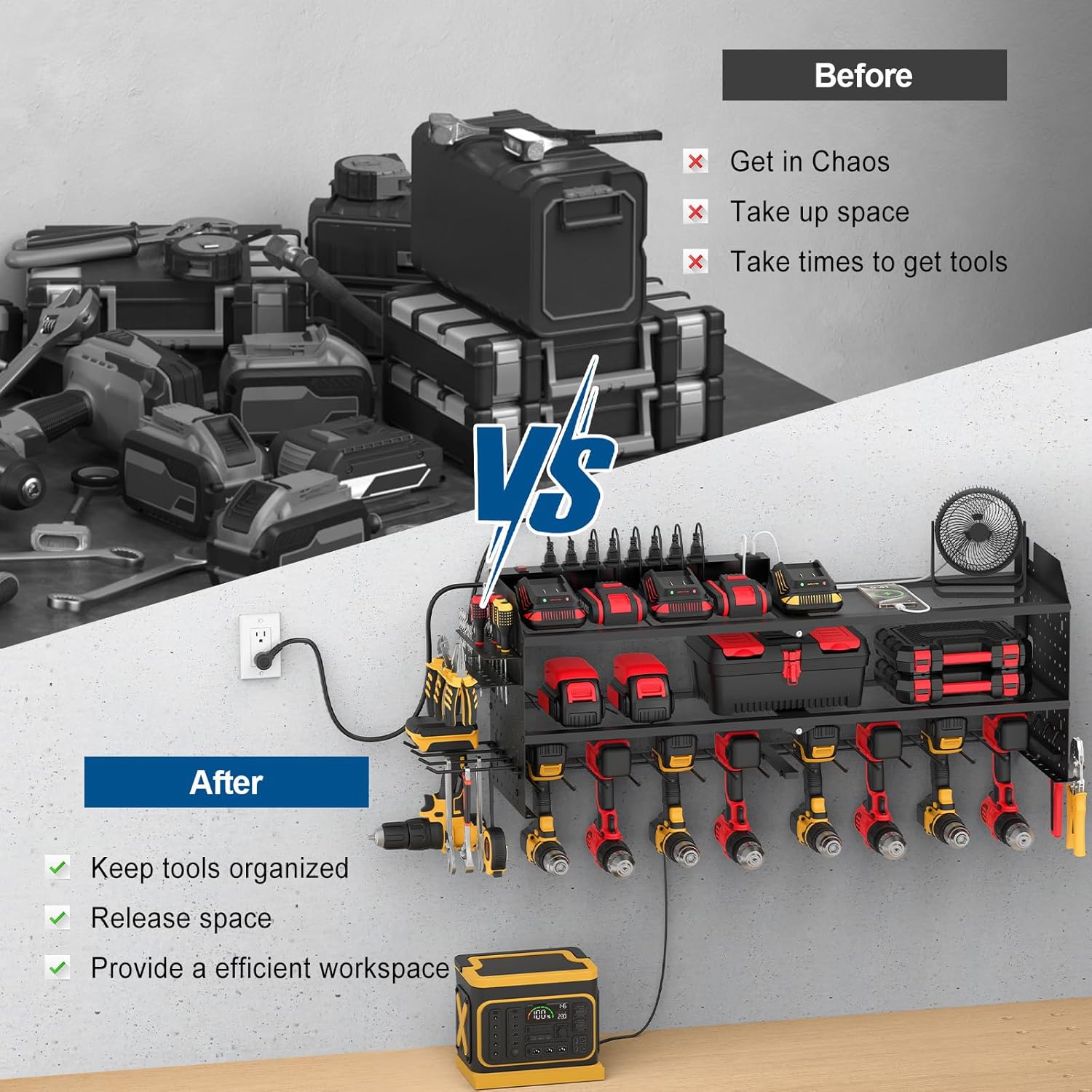 - No More Tool Chaos: JUNNUJ power tool organizer wall mount combines charging and storage in one, helping release space while keeping tools in order. No more clutter—just an organized, efficient workspace with tools always at the ready