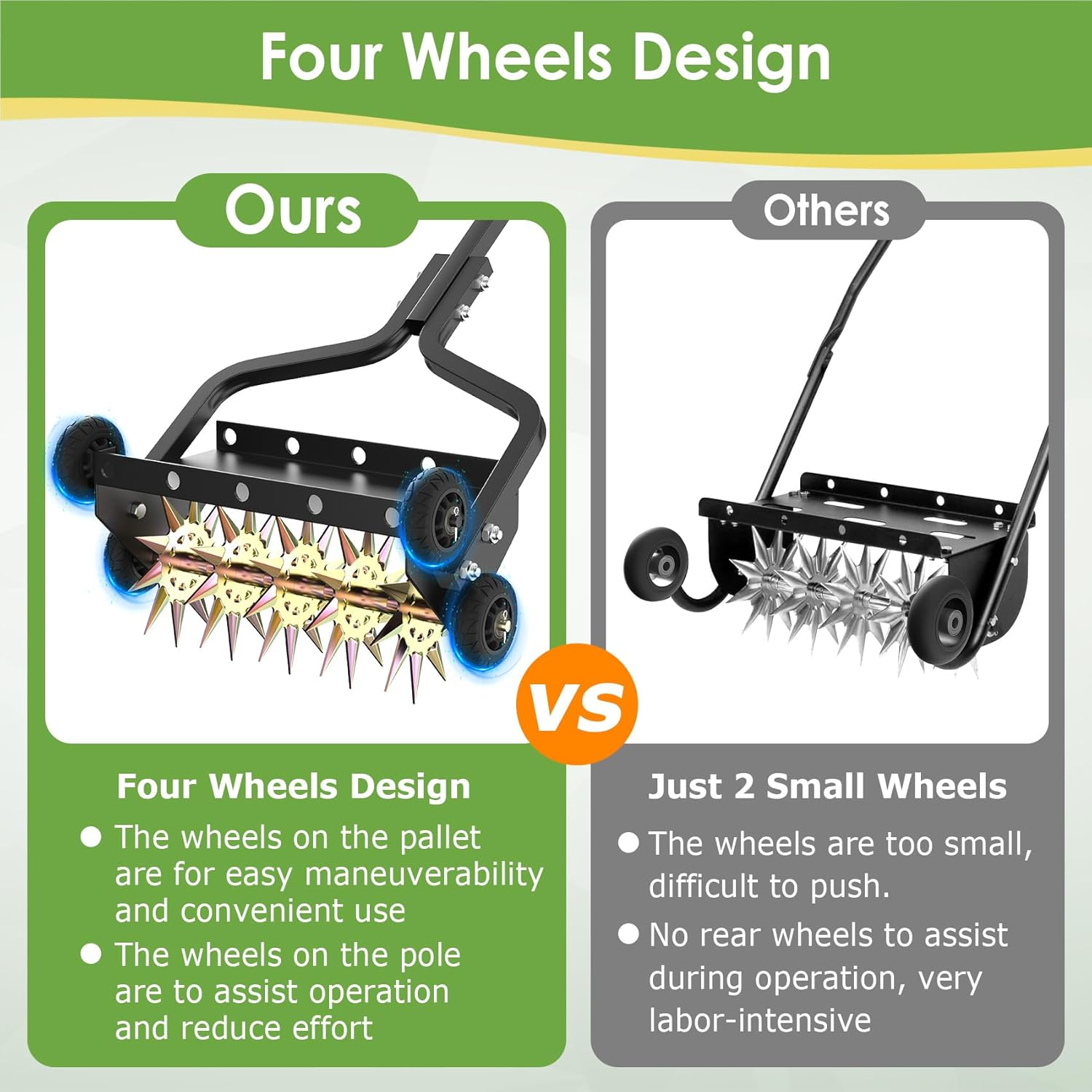 - 【Premium Material】Built with high-quality all-steel construction, this aerator features reinforced side panels and a solid steel axle for superior strength and durability. It resists rust and bending, even on compacted soil. The heavy-duty tray supports up to 220 lbs, allowing you to add cement blocks or weights to boost ground penetration for more effective lawn aeration