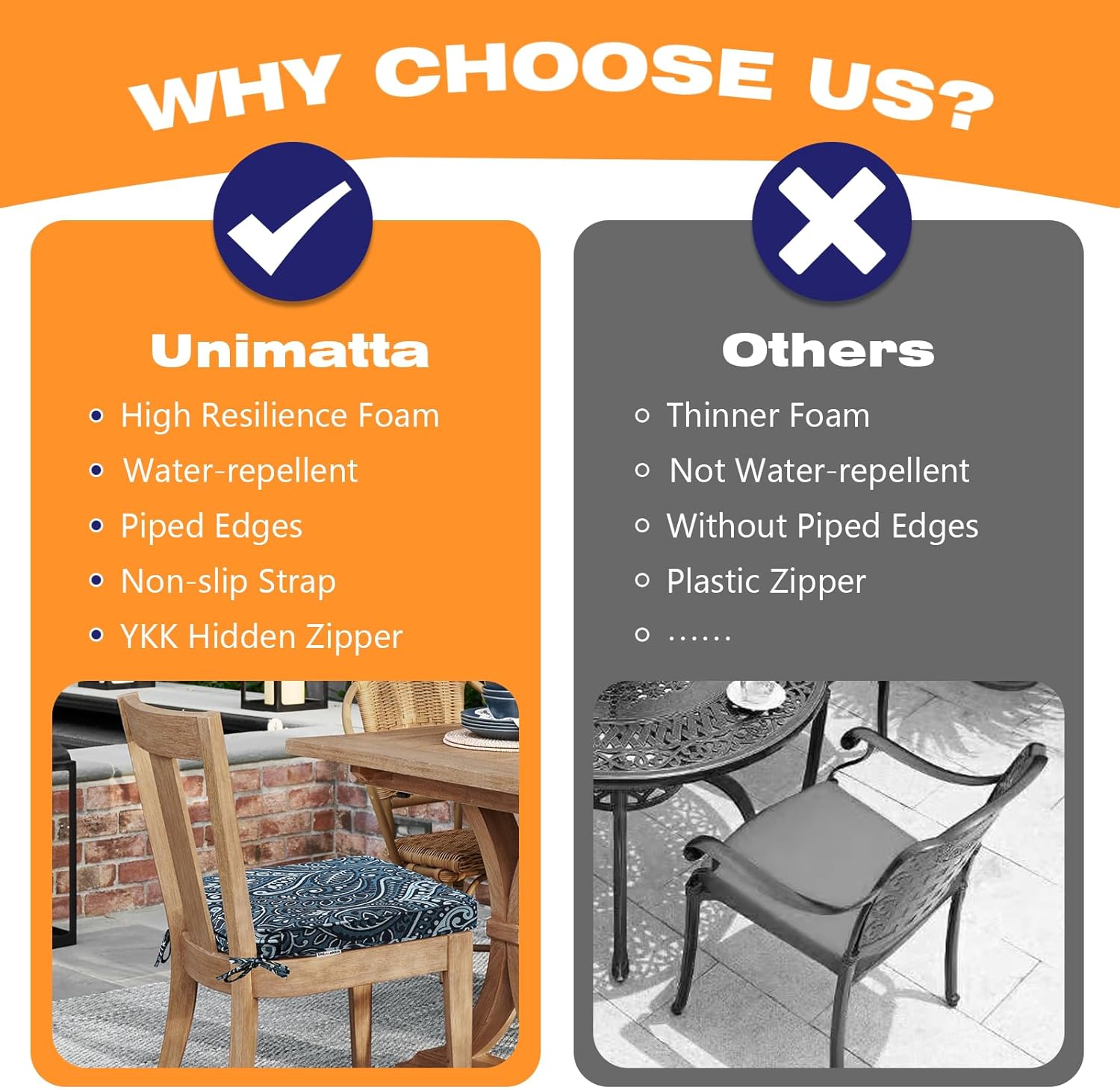 - 【High Resilience Foam】 The Unimatta chair cushions are filled with high-quality 100% foam, high-density sponge offers excellent support and long-lasing comfort. Whether you're enjoying a sunny afternoon or a cool evening, this cushion will keep you cozy.