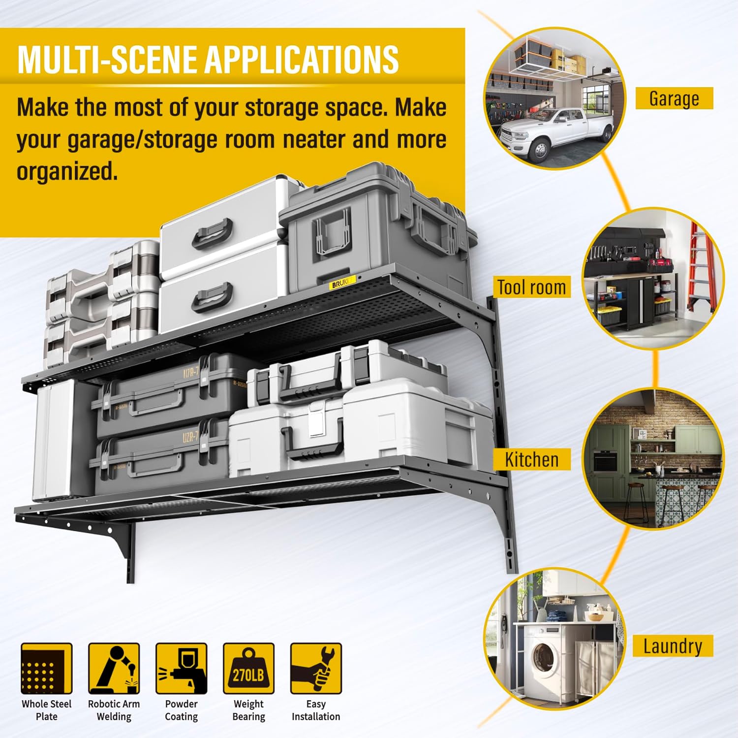 - 270lb Load Tested: Each panel of our Brukid heavy-duty wall shelf has been rigorously tested to support 135 lbs, with the 2-tier (1.3x4ft) unit offering a combined weight capacity of 270 lbs. Built for strength and reliability, it's perfect for heavy tools, equipment, or storage needs.