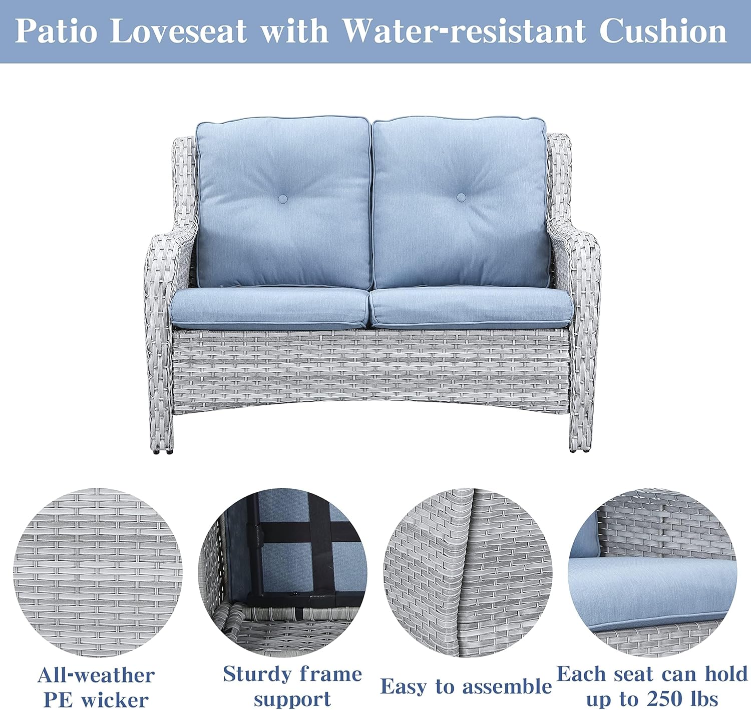 Outdoor Loveseat Small Patio Furniture 2 Seater Wicker Sofa Couch Rattan Seating for Deck Porch Backyard Baby Blue Cushion