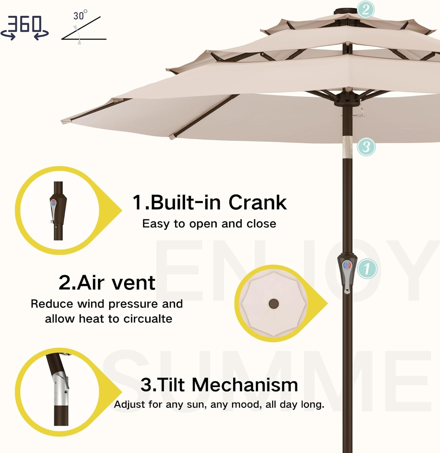 Kingdura 10ft 3-Tier Patio Umbrella, Outdoor Table Umbrella with Easy Crank & Tilt, 8 Reinforced Ribs, UV Protection for Deck, Pool, Market, Backyard (Beige)
